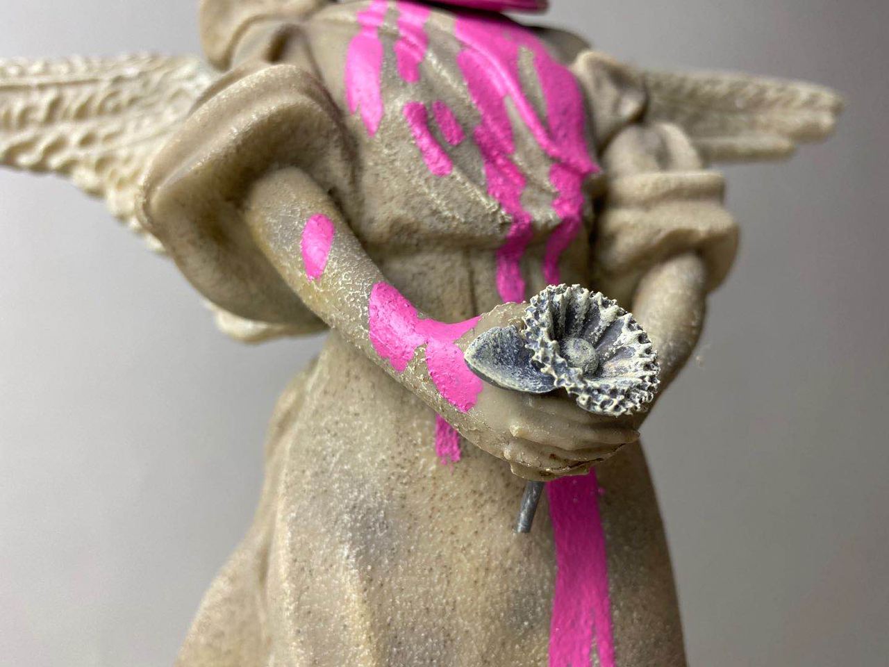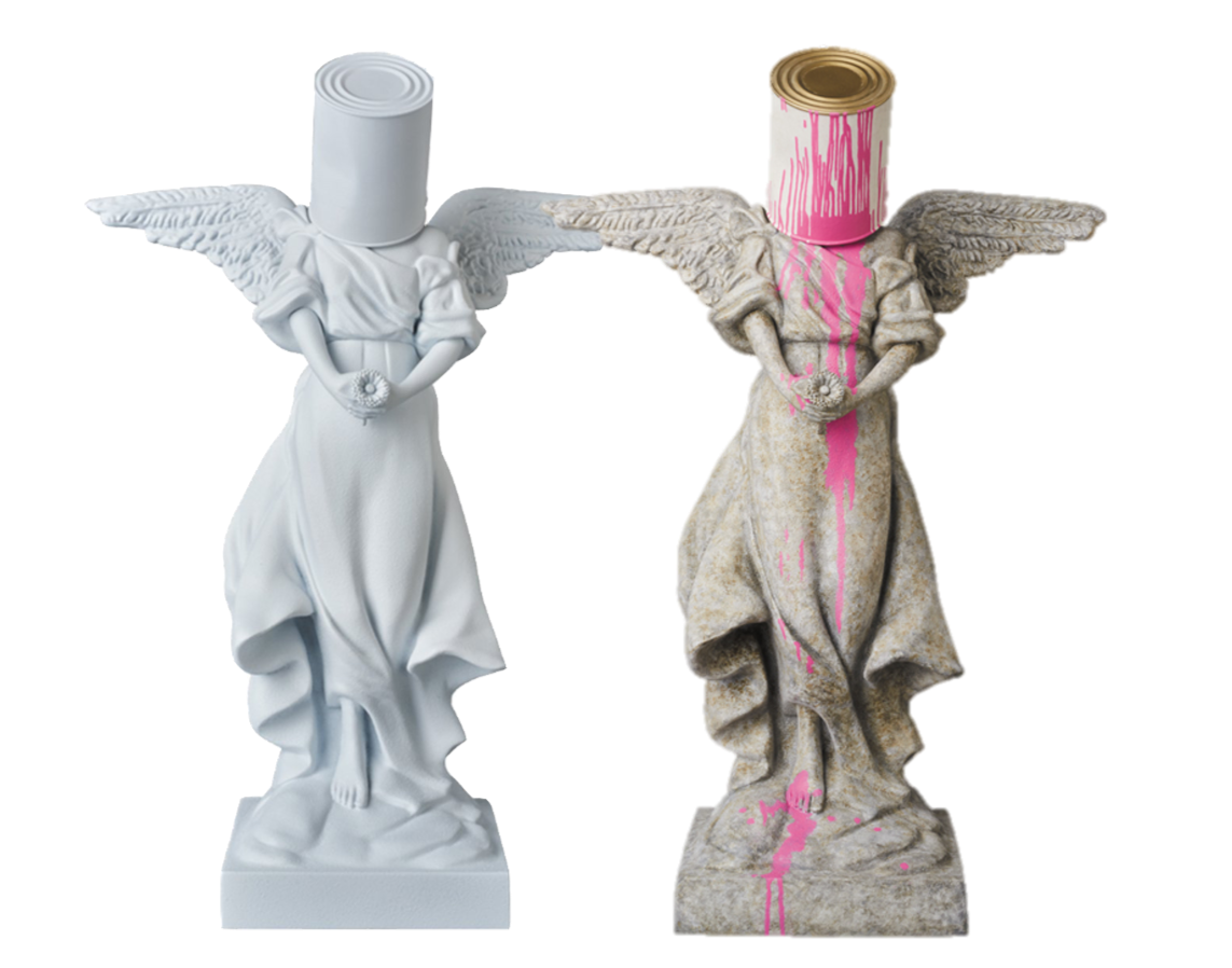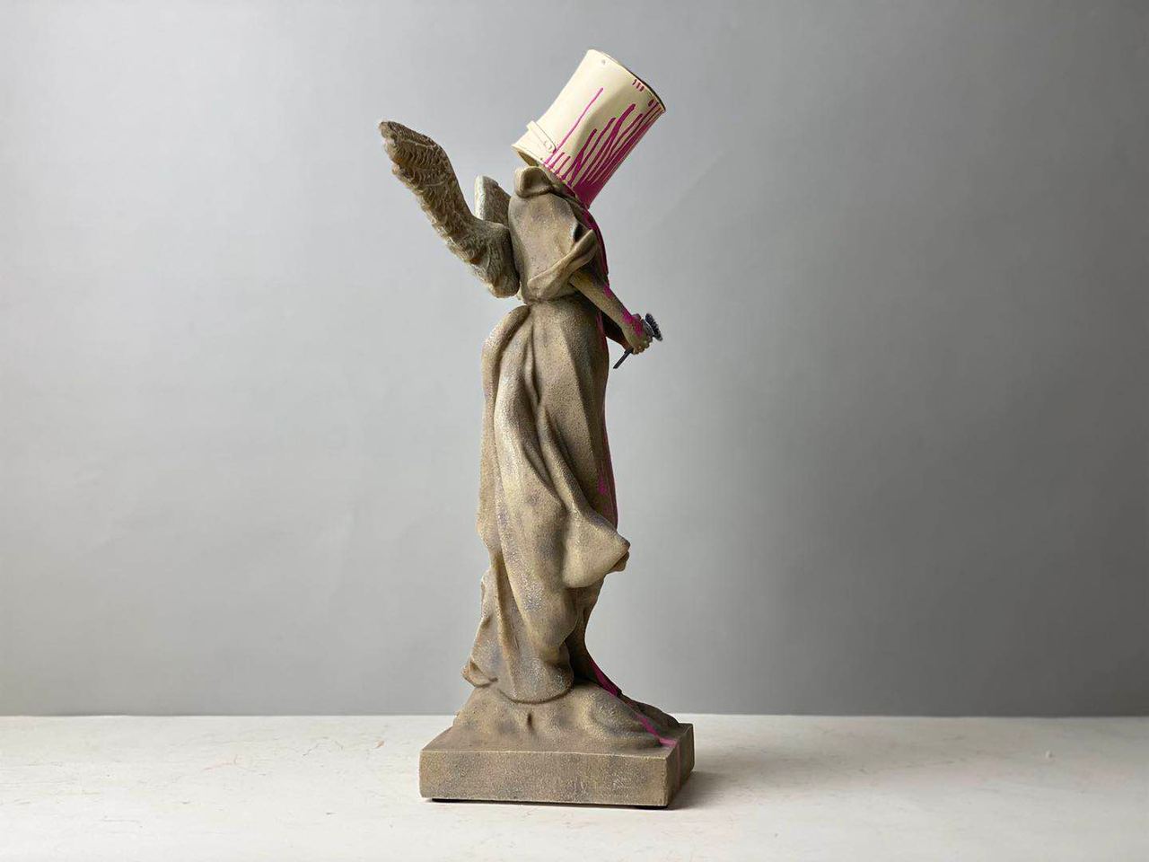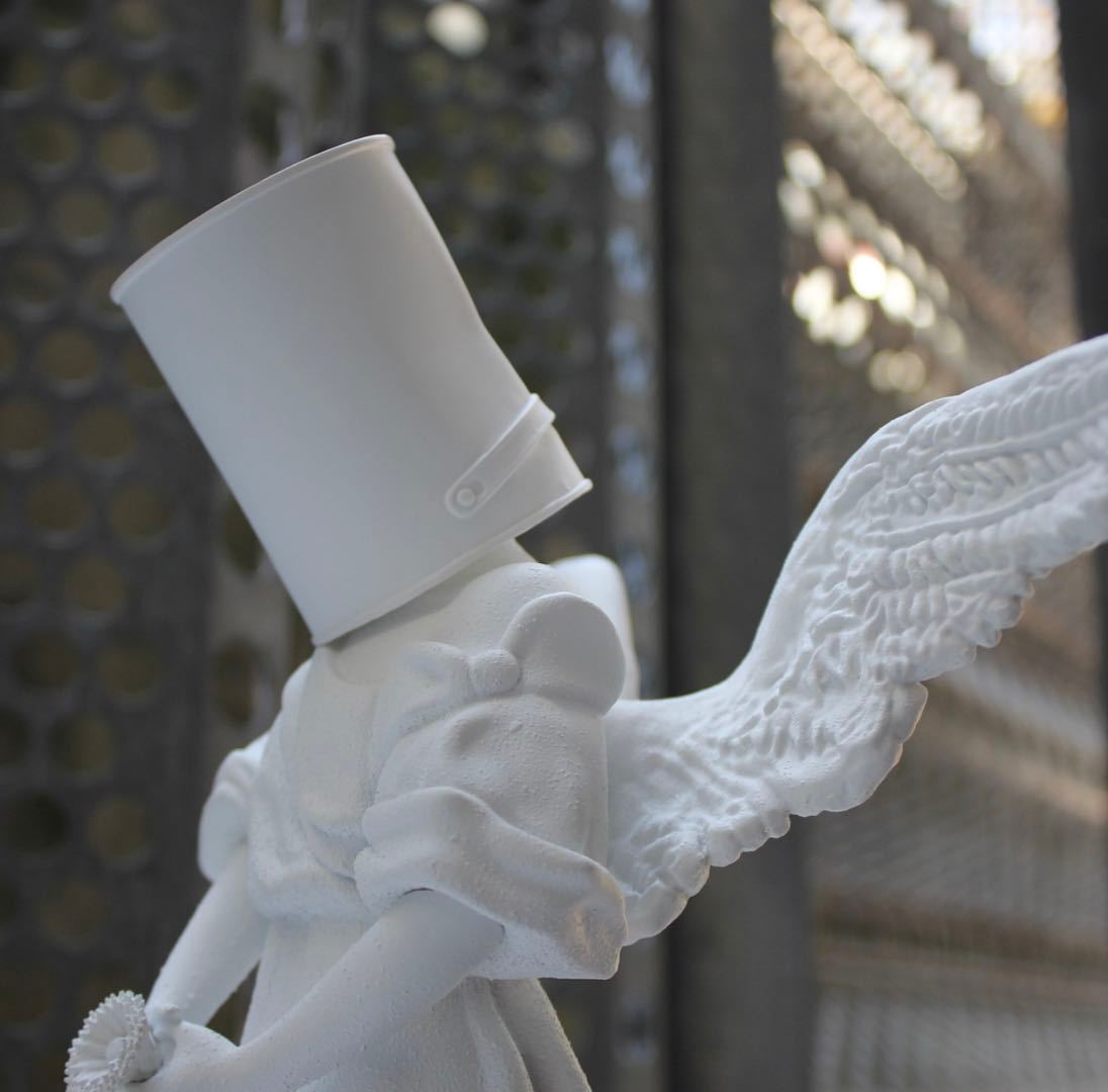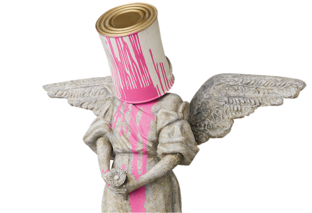 Pink Angel is Banksy’s reinterpretation of a 19th century plaster cast of an angel with a paint bucket on its head.
