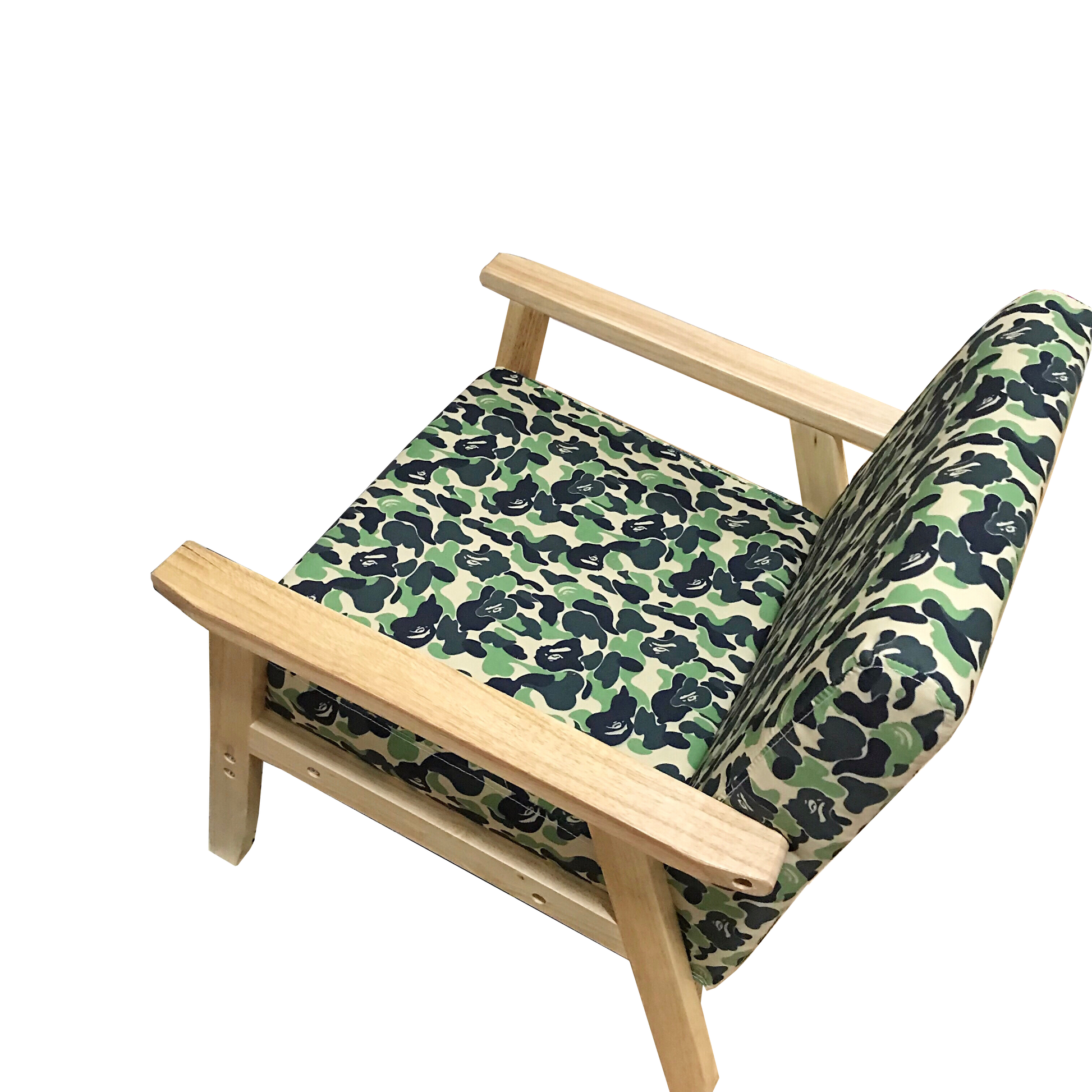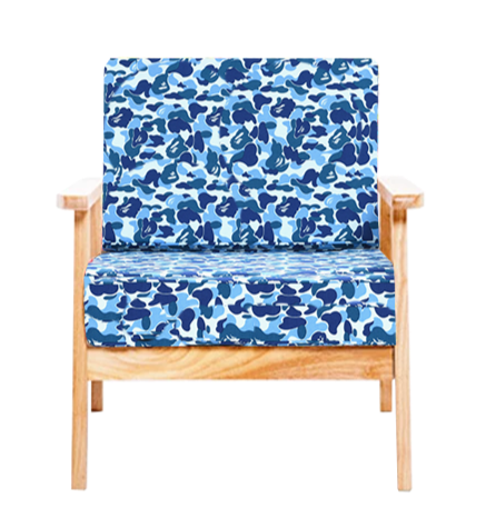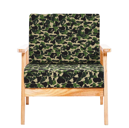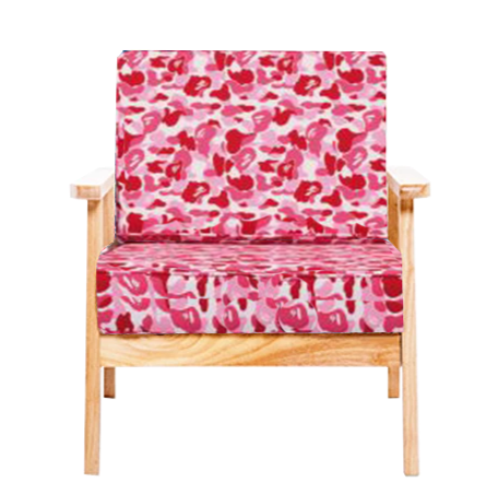 Featuring a minimalist frame that boasts organic grain patterns and a light brown tone, while the cushion and backrest display the charm of the iconic BAPE camo pattern.