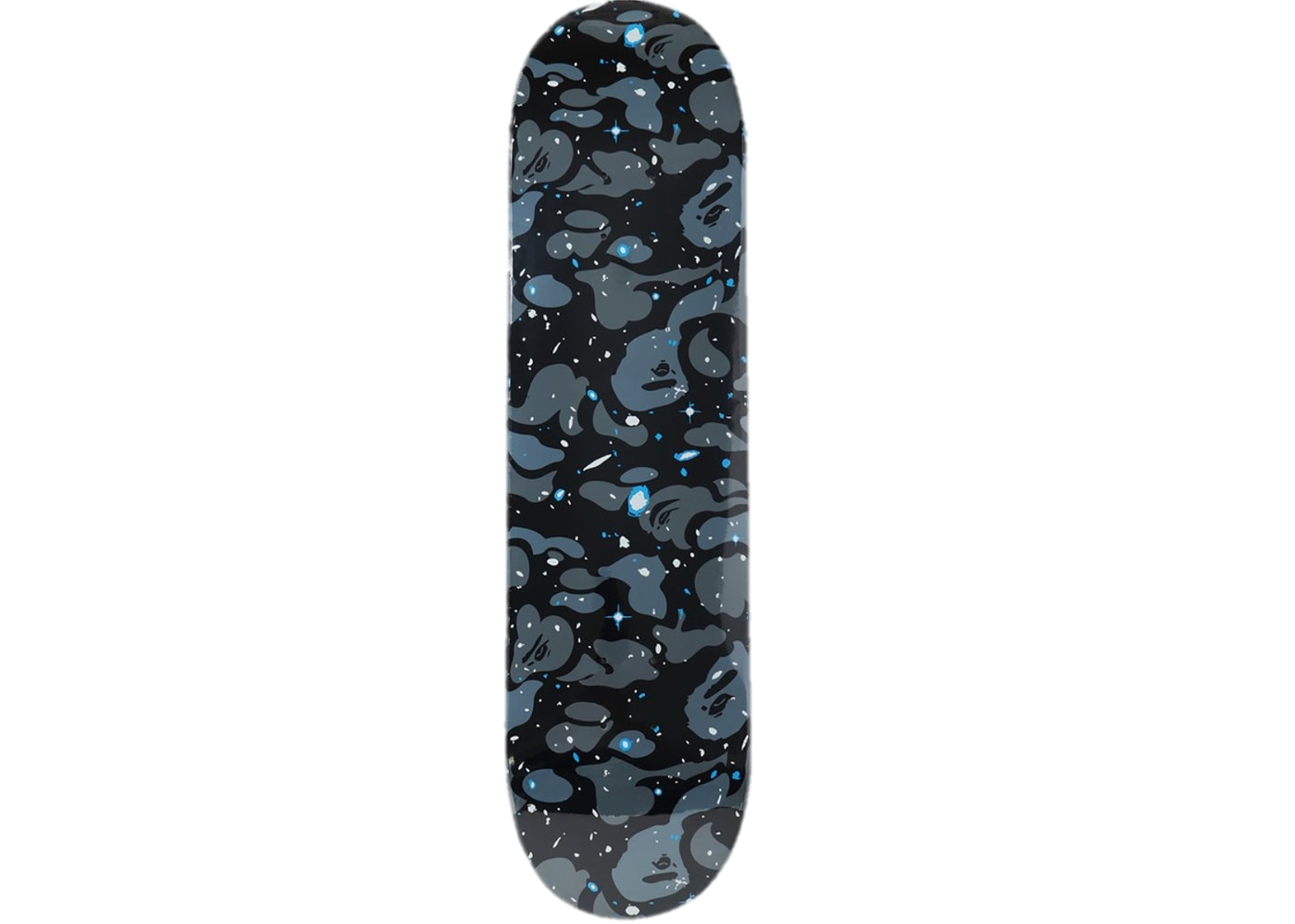 BAPE’s SPACE CAMO skateboard deck features the brand’s signature Ape Head motif, with galactic stars detailing. The reverse side features a plain background that highlights the Ape Head logo.