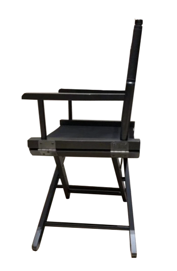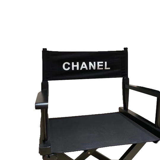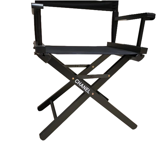 CHANEL DIRECTOR'S CHAIR sits 18" high and features a solid wood structure and a canvas back with the word "CHANEL" printed on it.