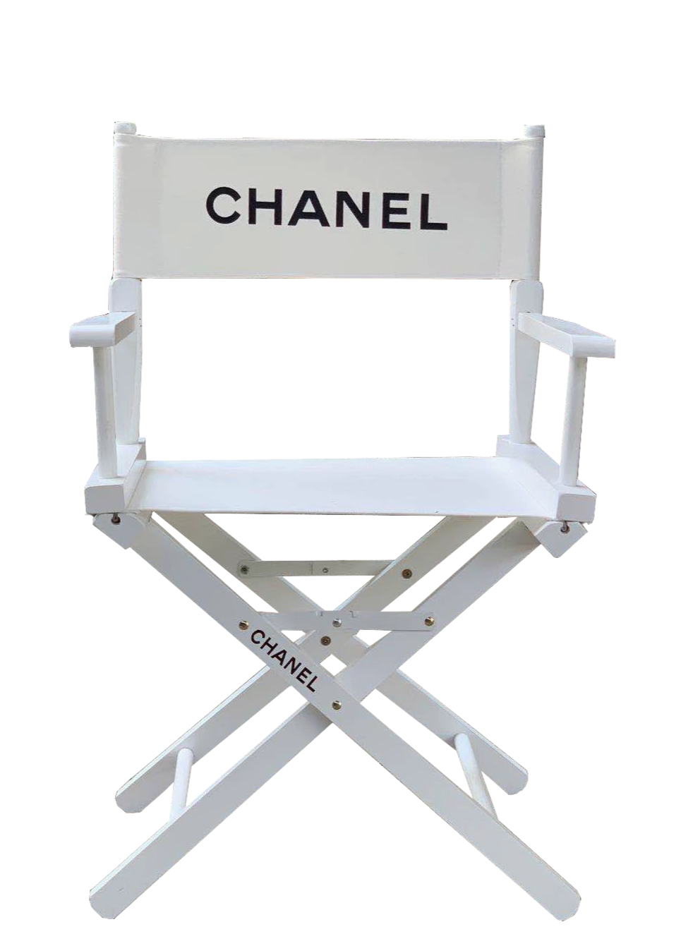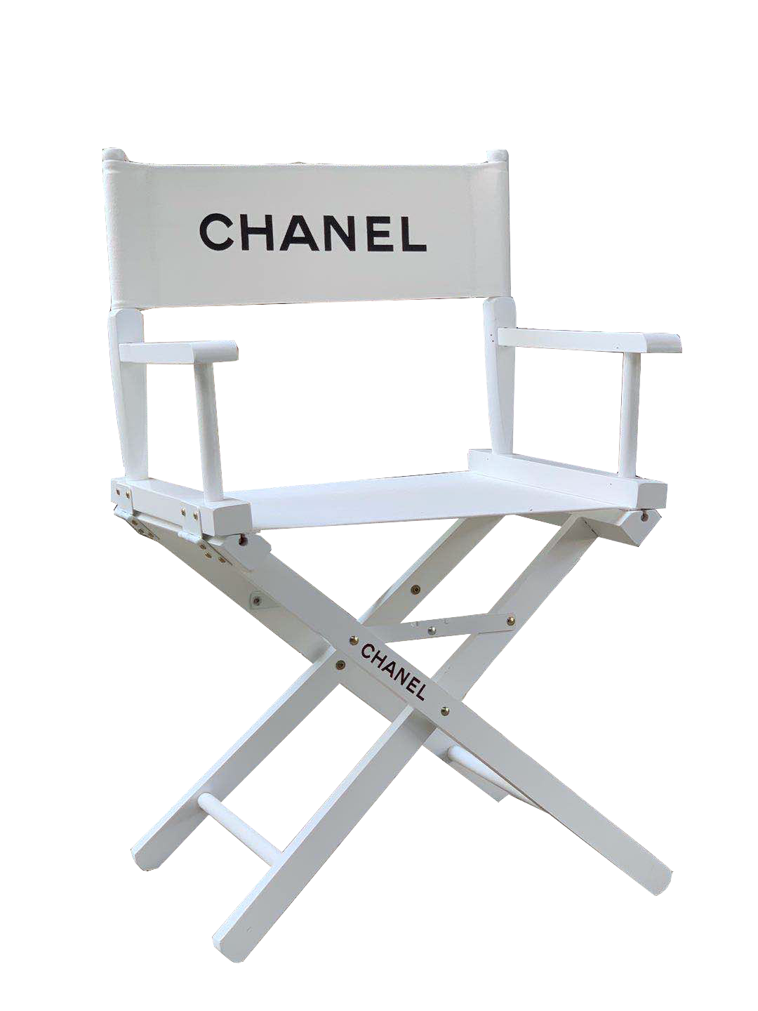 CHANEL PRESIDENTIAL CHAIR sits 18" high and features a solid wood structure and a canvas back with the word "CHANEL" printed on it.