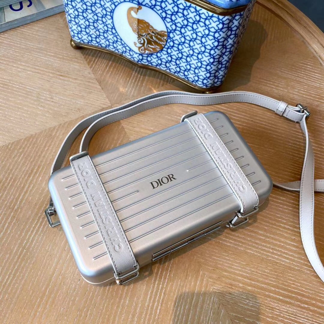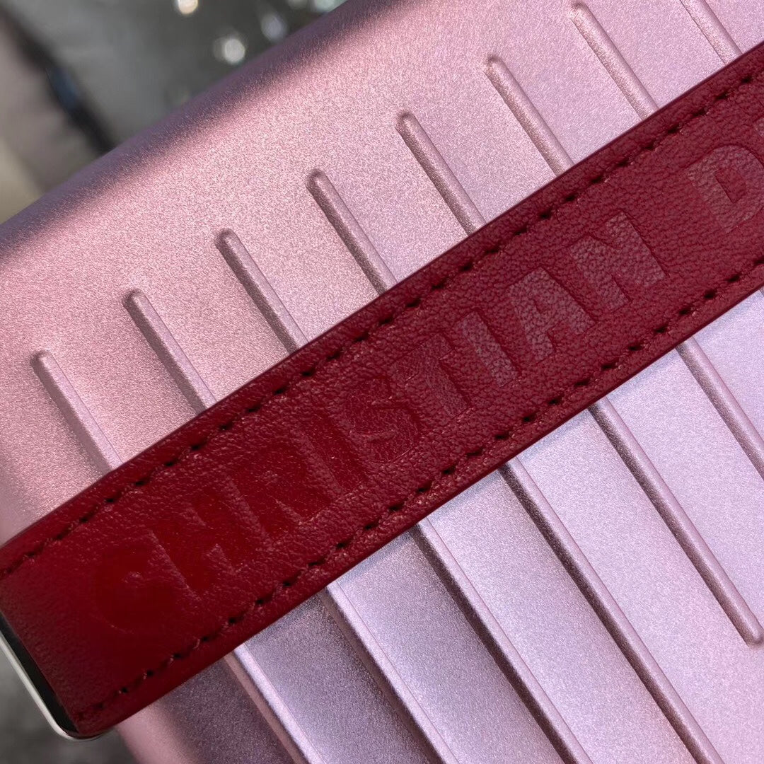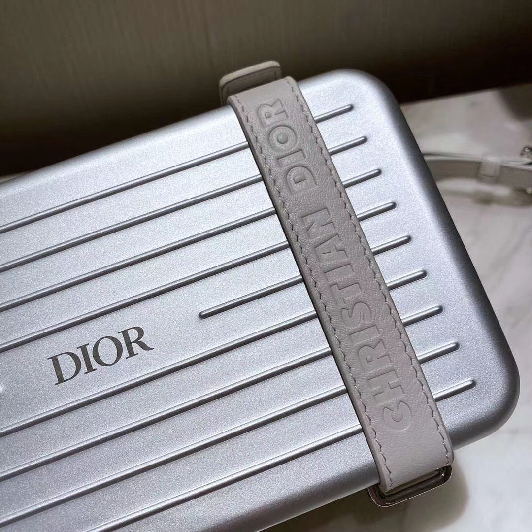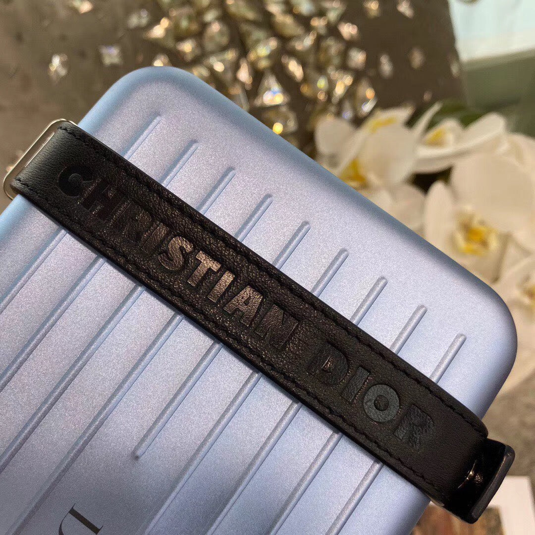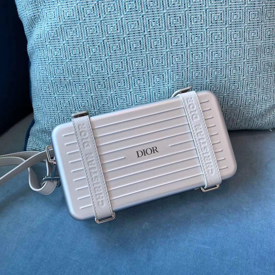 The DIOR and RIMOWA personal clutch is a compact accessory designed for easy, everyday carriage. It is made from lightweight aluminum and features 'Christian Dior' logo embossed leather straps that fasten around the bag with snap buttons. The rectangular wallet clutch is small enough to be carried by hand, and can also be worn over the shoulder with the optional leather strap.