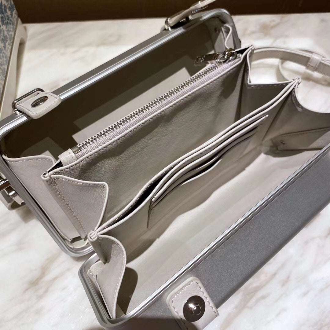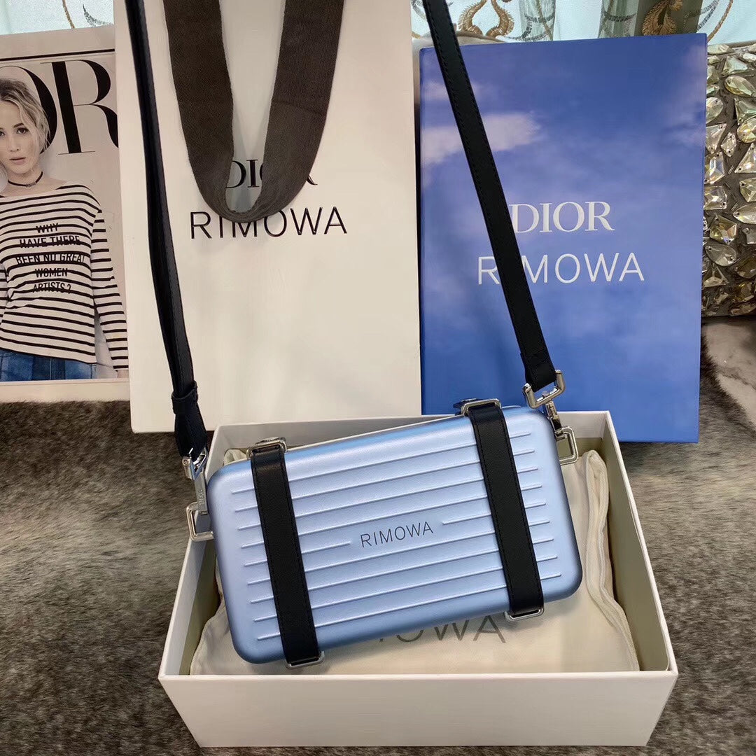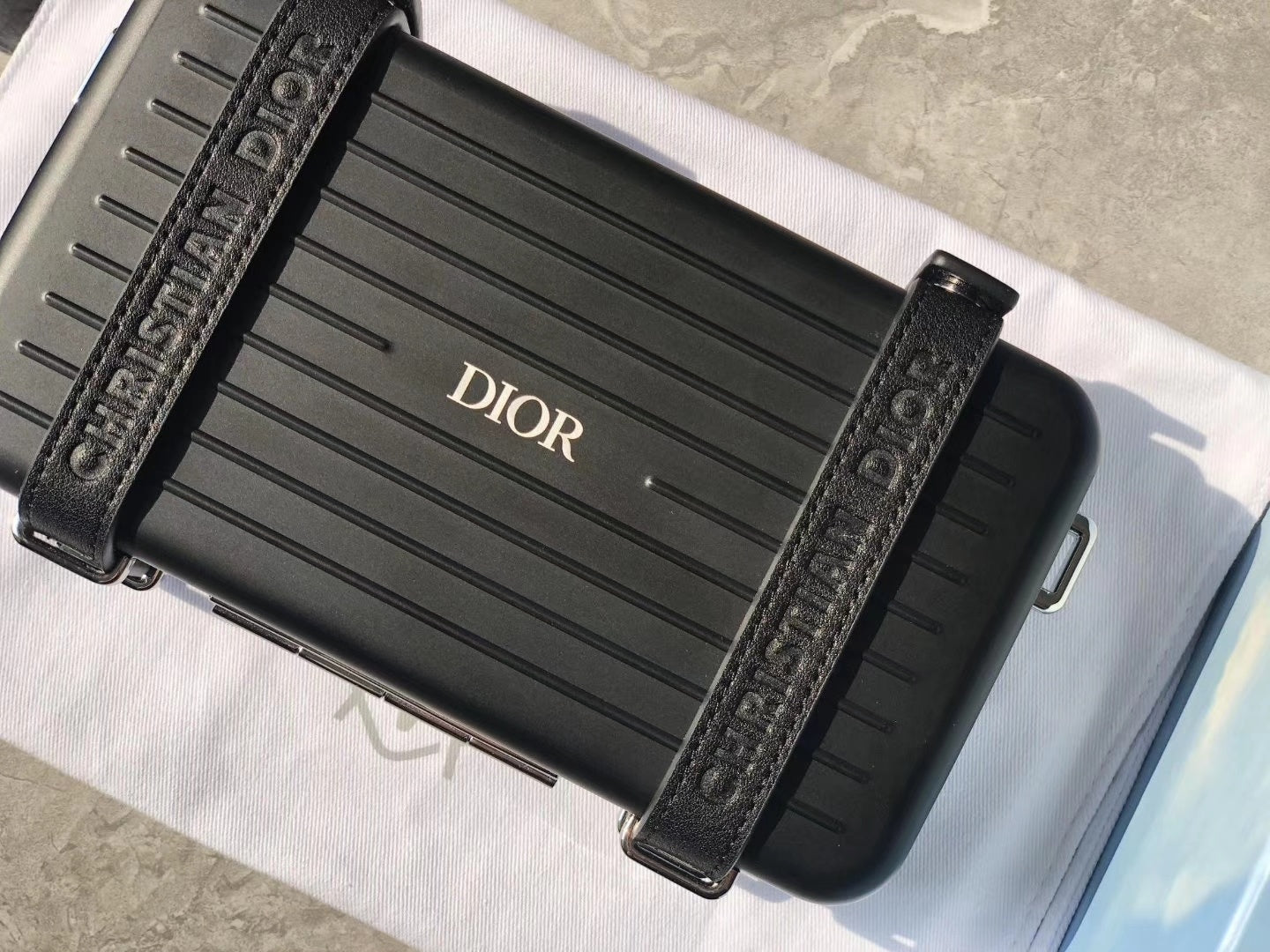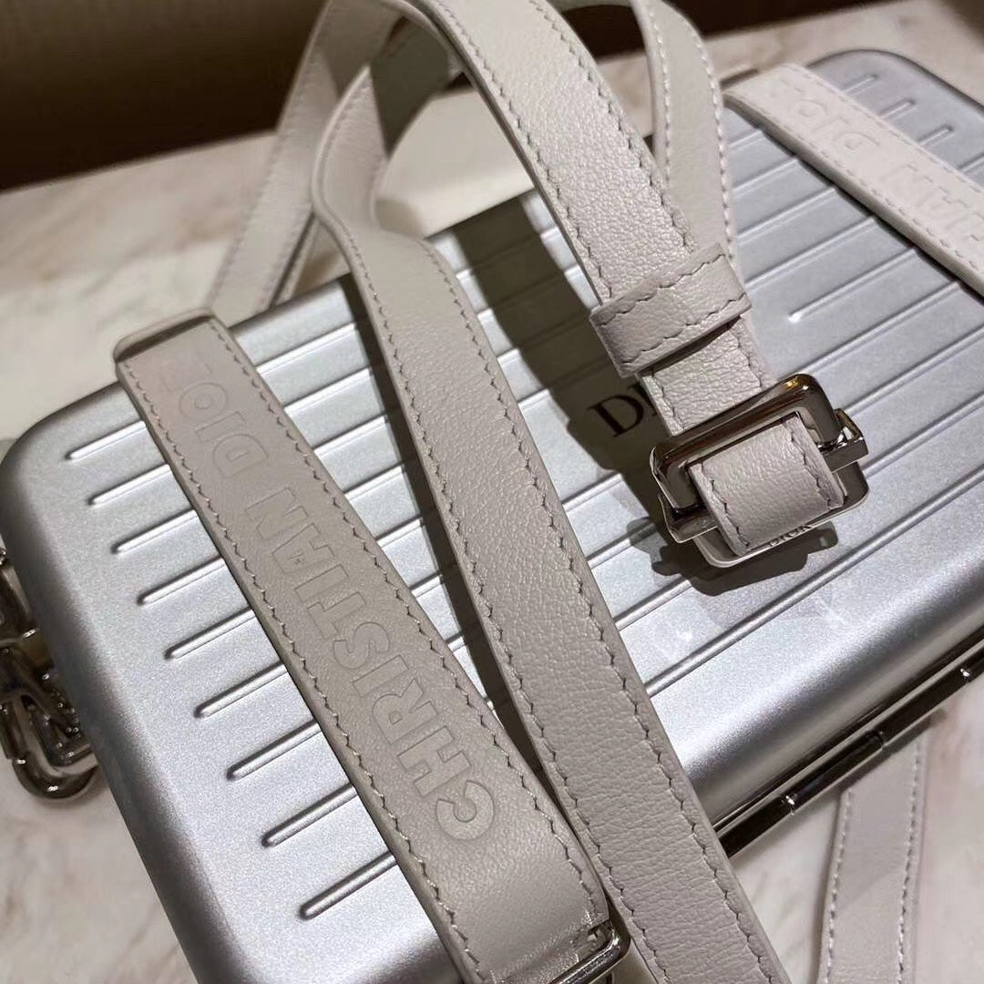 The DIOR and RIMOWA personal clutch is a compact accessory designed for easy, everyday carriage. It is made from lightweight aluminum and features 'Christian Dior' logo embossed leather straps that fasten around the bag with snap buttons. The rectangular wallet clutch is small enough to be carried by hand, and can also be worn over the shoulder with the optional leather strap.