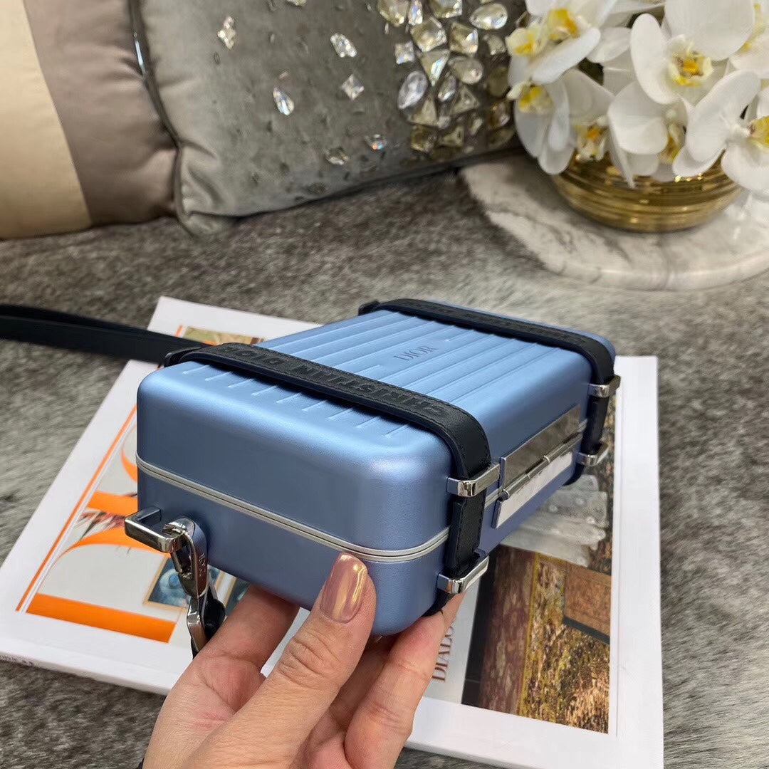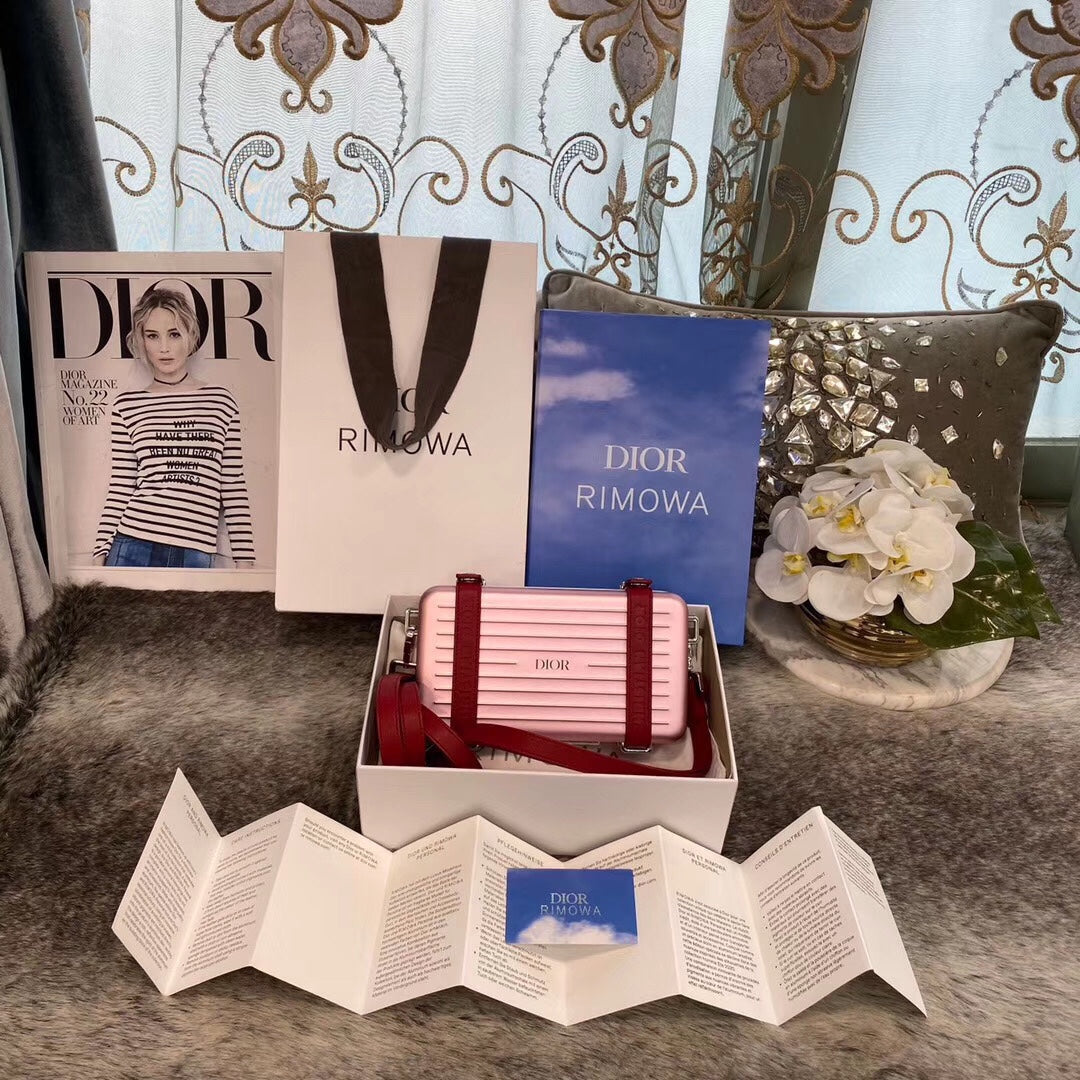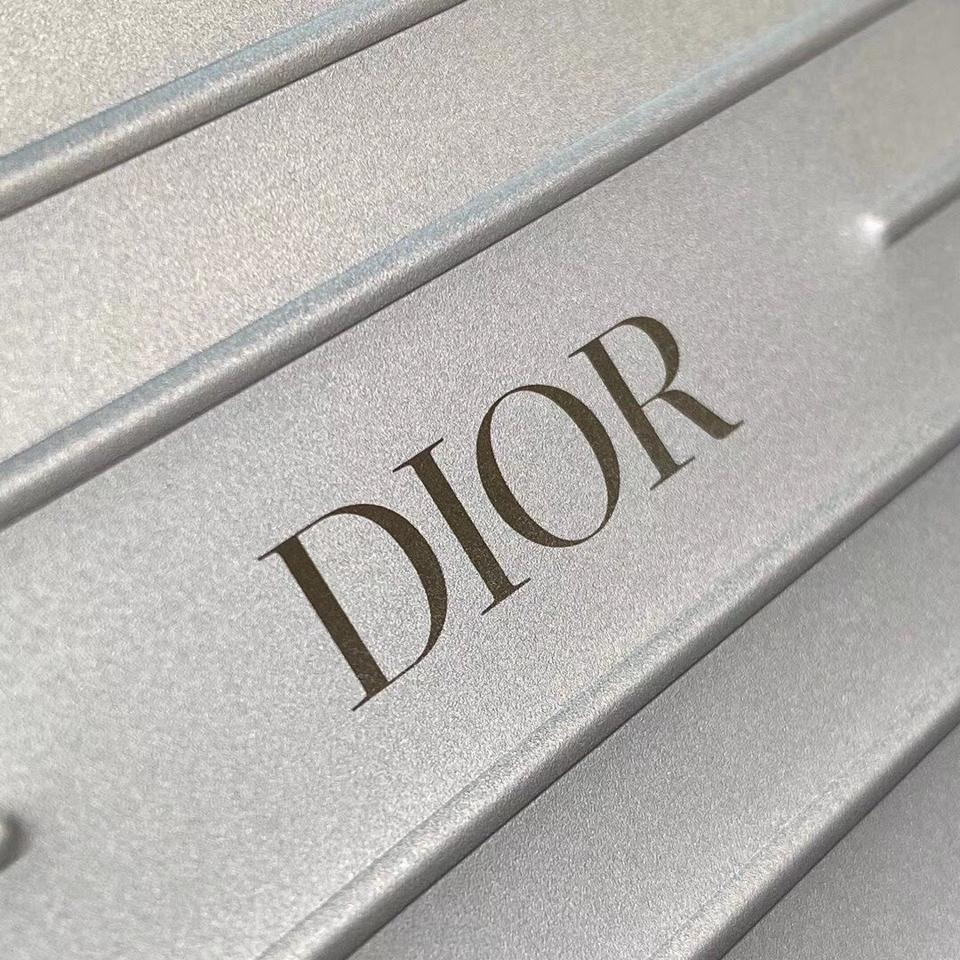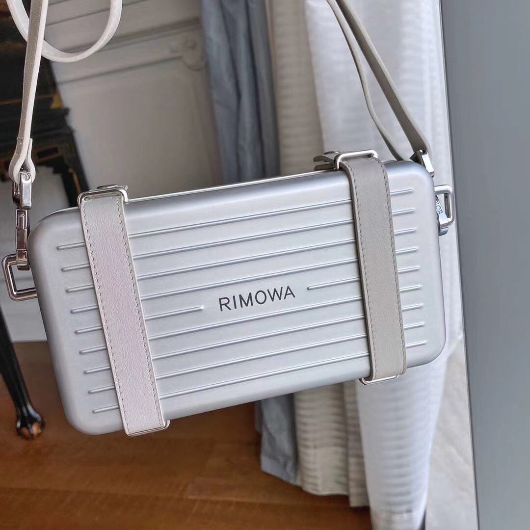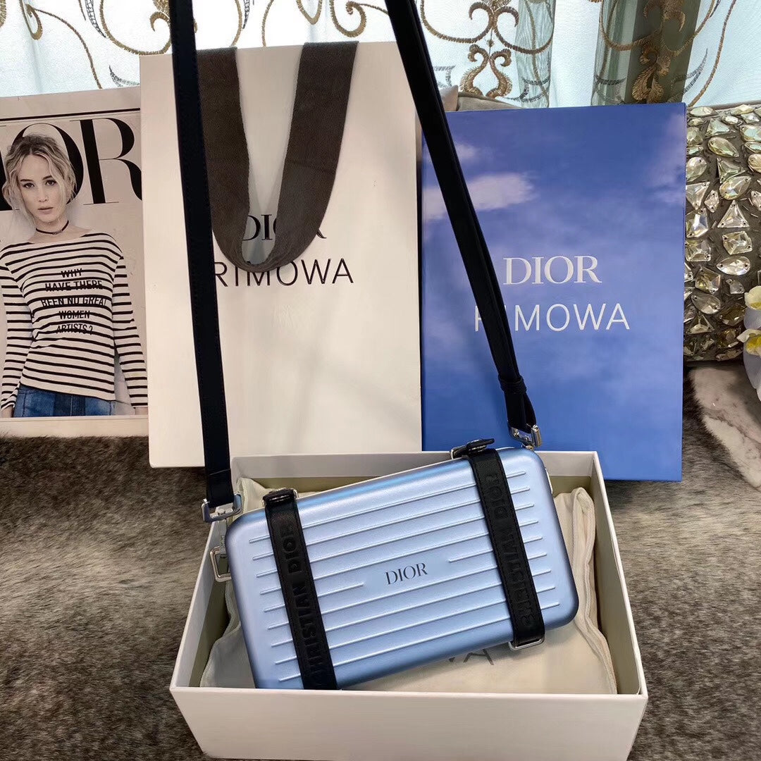 The DIOR and RIMOWA personal clutch is a compact accessory designed for easy, everyday carriage. It is made from lightweight aluminum and features 'Christian Dior' logo embossed leather straps that fasten around the bag with snap buttons. The rectangular wallet clutch is small enough to be carried by hand, and can also be worn over the shoulder with the optional leather strap.