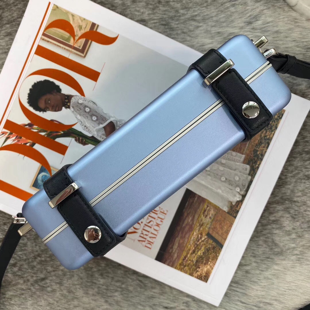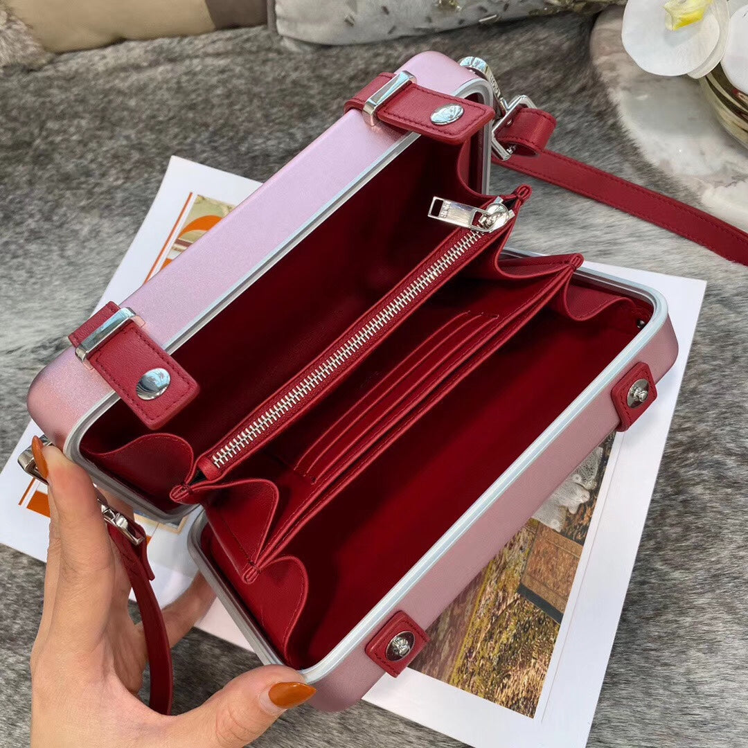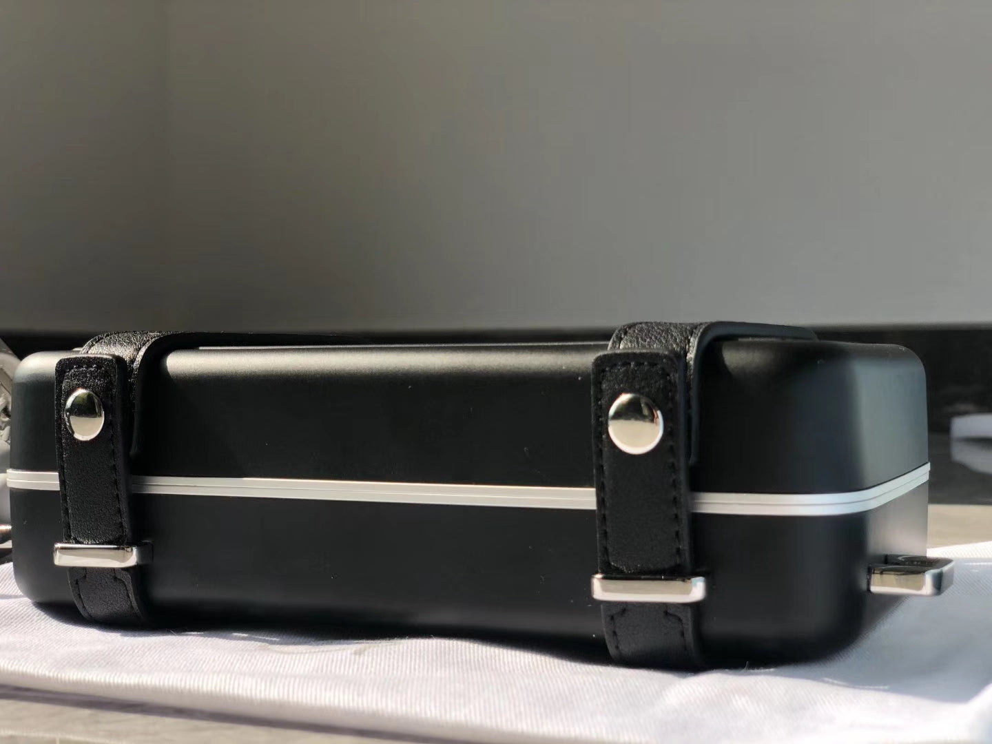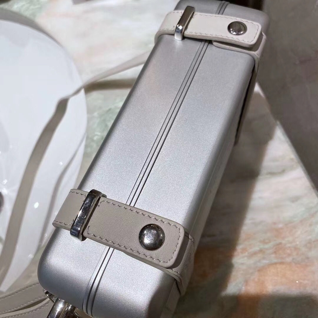 The DIOR and RIMOWA personal clutch is a compact accessory designed for easy, everyday carriage. It is made from lightweight aluminum and features 'Christian Dior' logo embossed leather straps that fasten around the bag with snap buttons. The rectangular wallet clutch is small enough to be carried by hand, and can also be worn over the shoulder with the optional leather strap.