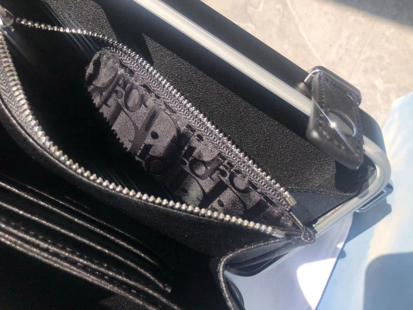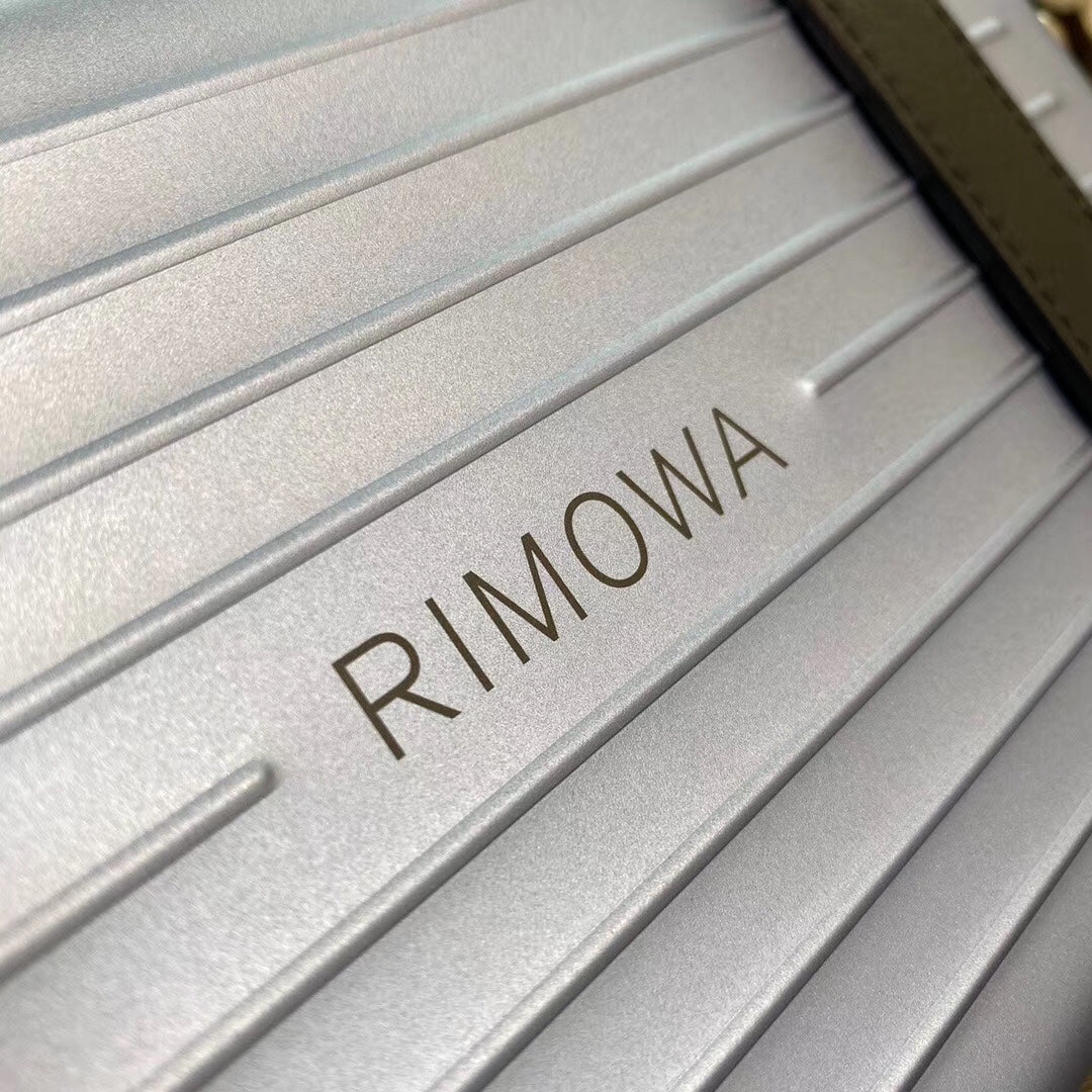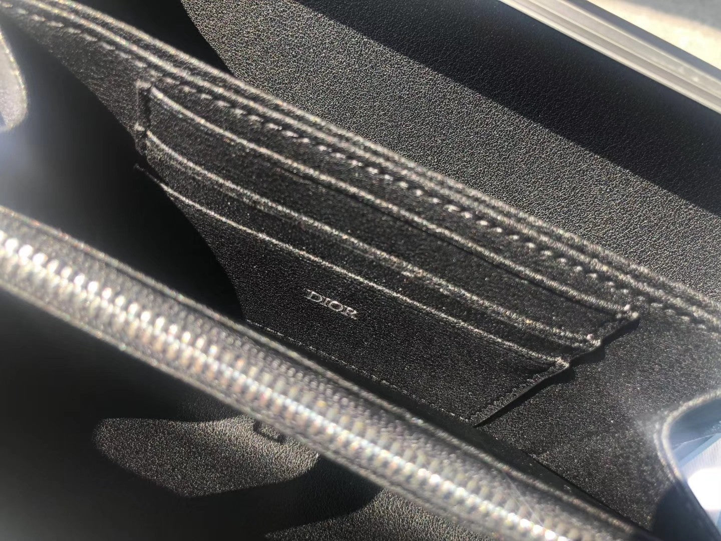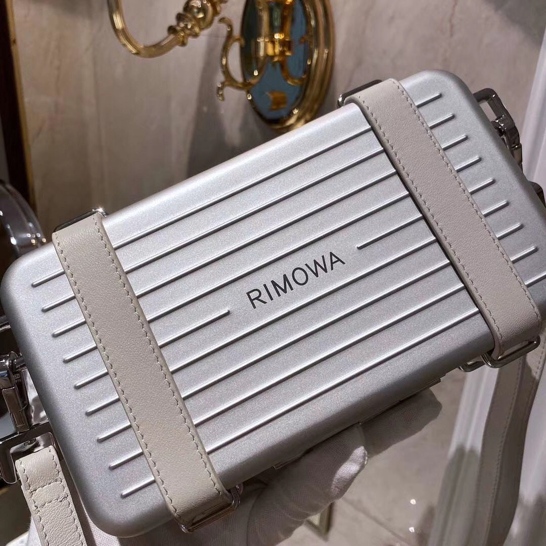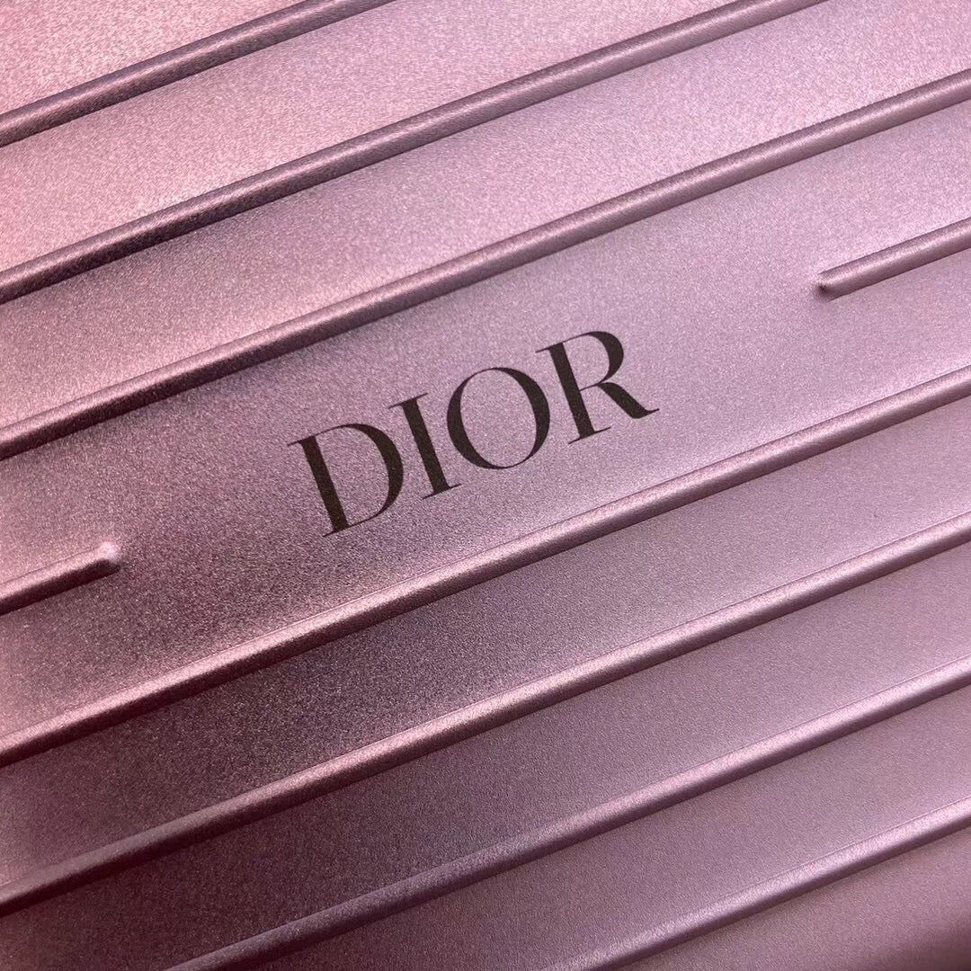 The DIOR and RIMOWA personal clutch is a compact accessory designed for easy, everyday carriage. It is made from lightweight aluminum and features 'Christian Dior' logo embossed leather straps that fasten around the bag with snap buttons. The rectangular wallet clutch is small enough to be carried by hand, and can also be worn over the shoulder with the optional leather strap.