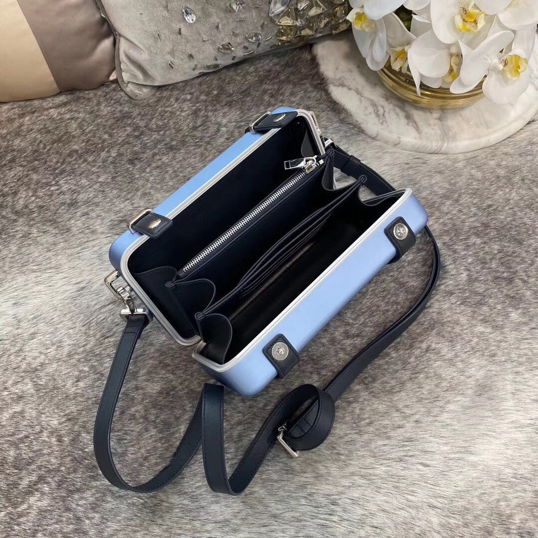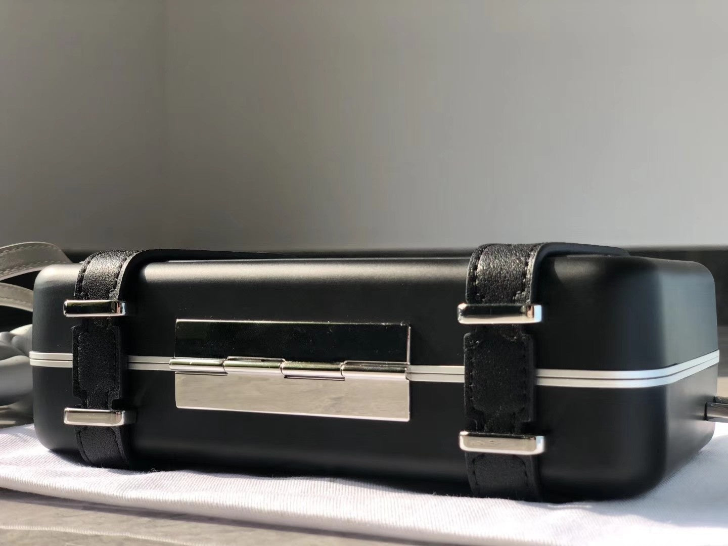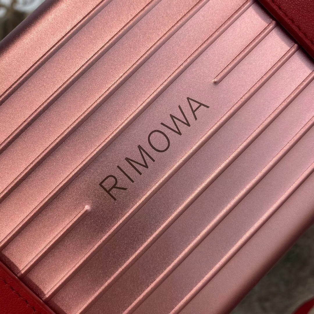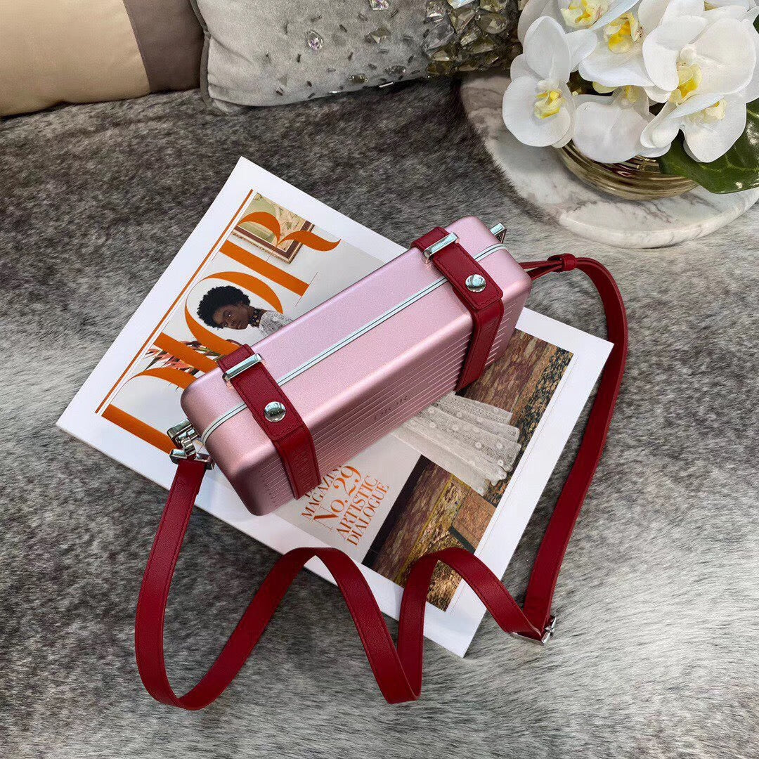 The DIOR and RIMOWA personal clutch is a compact accessory designed for easy, everyday carriage. It is made from lightweight aluminum and features 'Christian Dior' logo embossed leather straps that fasten around the bag with snap buttons. The rectangular wallet clutch is small enough to be carried by hand, and can also be worn over the shoulder with the optional leather strap.