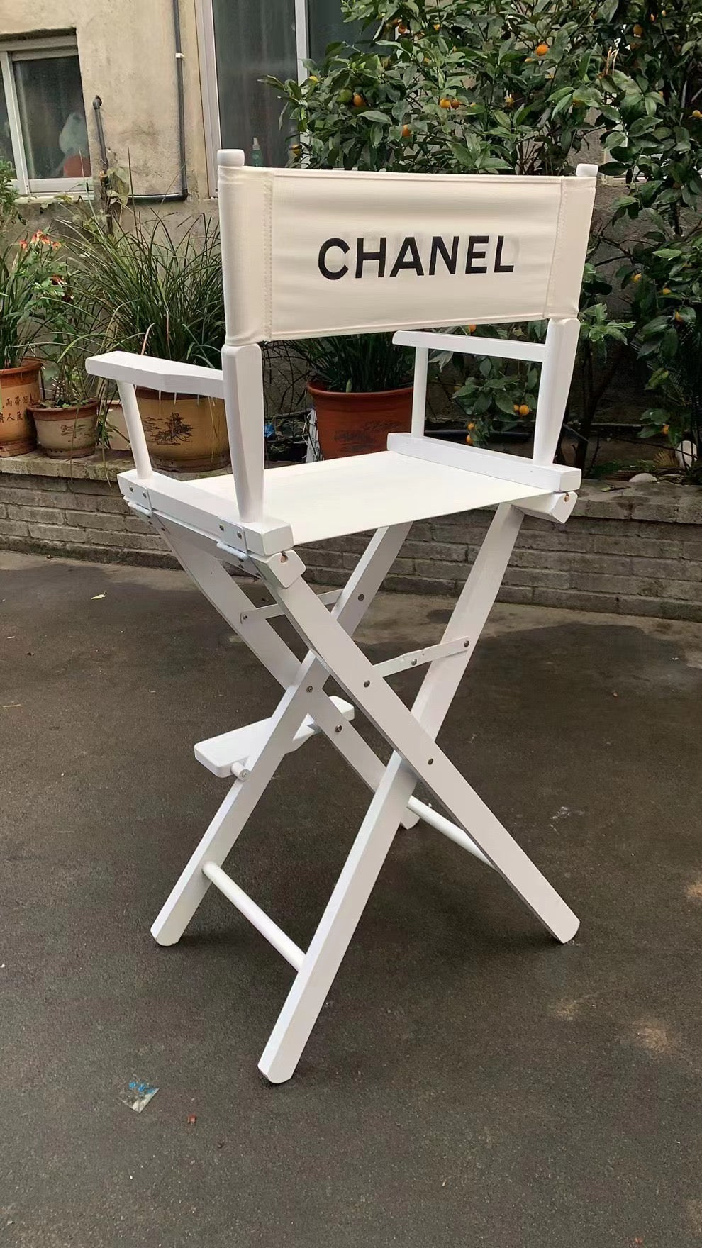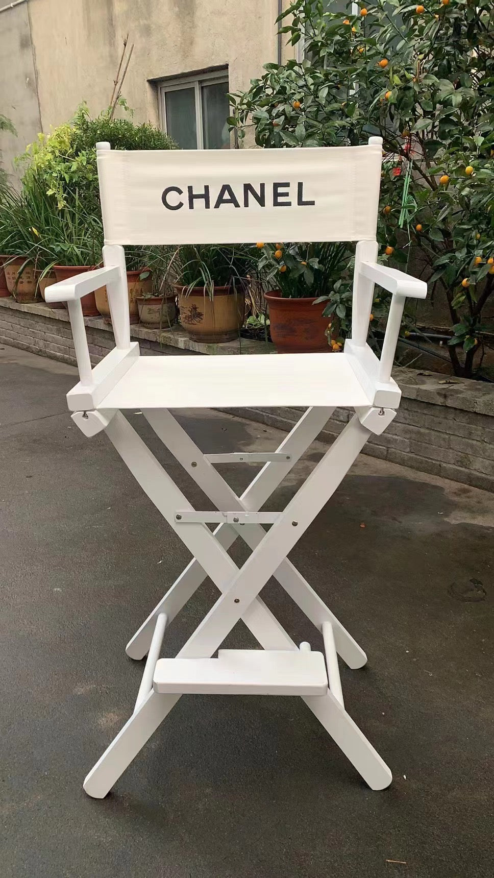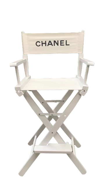 COCO PRESIDENTIAL HIGH CHAIR sits 18" high and features a solid wood structure and a canvas back with the word "CHANEL" printed on it.