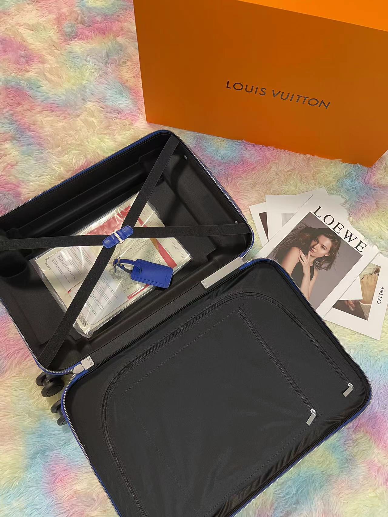 The ultra-practical Horizon 55 luggage is fashioned from Monogram canvas paired with Taiga cowhide leather as part of the Taigarama travel line. The blend of textured leather and coated canvas in the same colorway emphasizes the Horizon’s pure lines. A surprisingly spacious carry-on, it features four double compact wheels so it’s easy to roll.