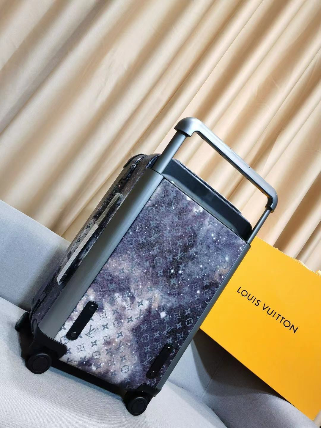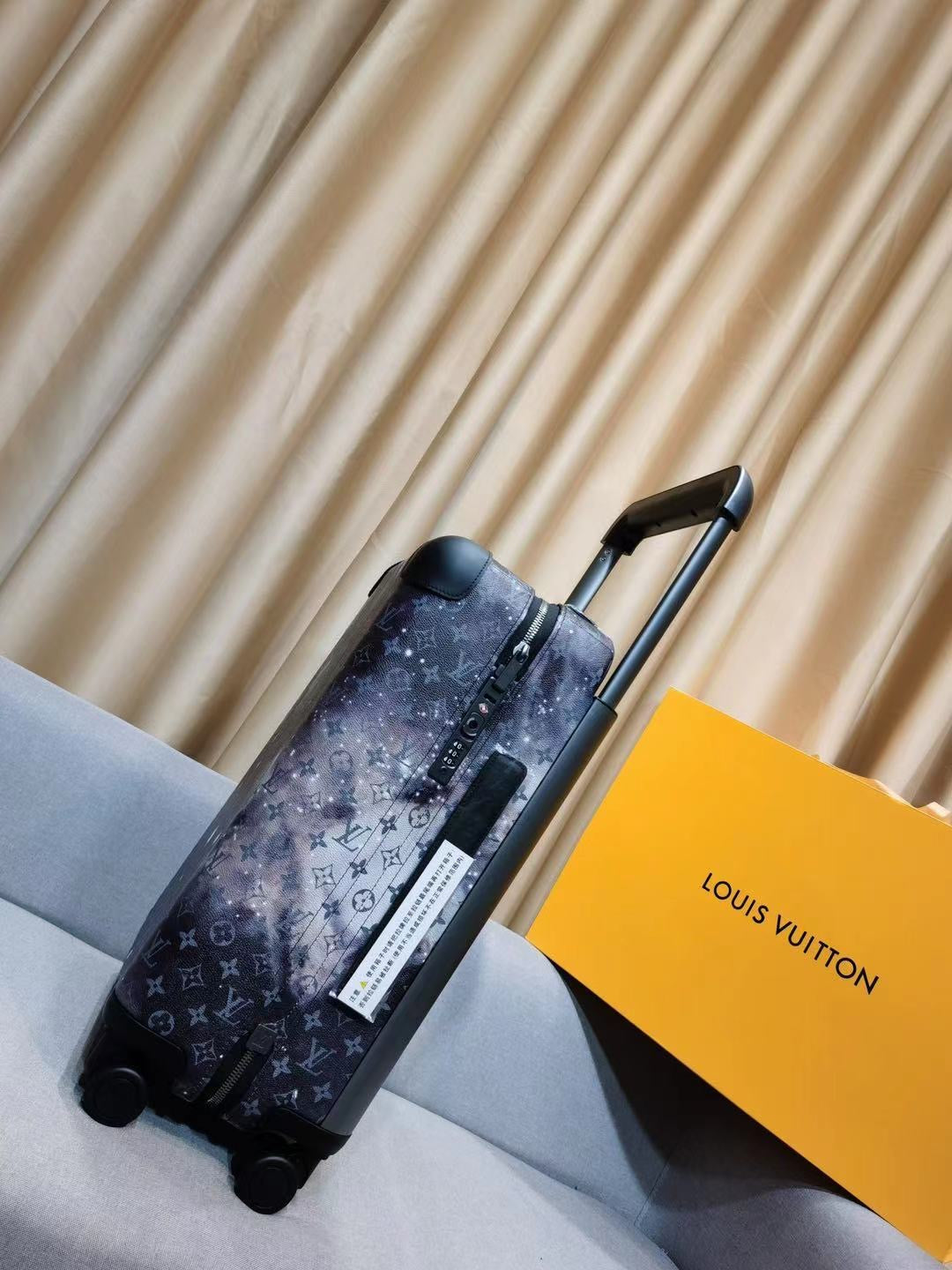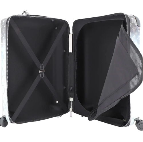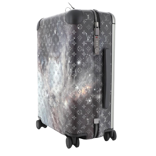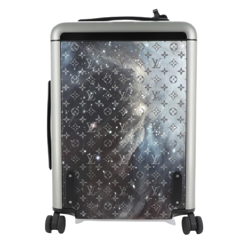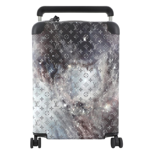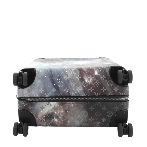 This Louis Vuitton Horizon Luggage Limited Edition Monogram Galaxy Canvas 55, crafted in black monogram galaxy coated canvas, features black leather handles, pull and roller mechanisms, and gunmetal-tone hardware. Its zip closure opens to a black nylon and fabric interior.