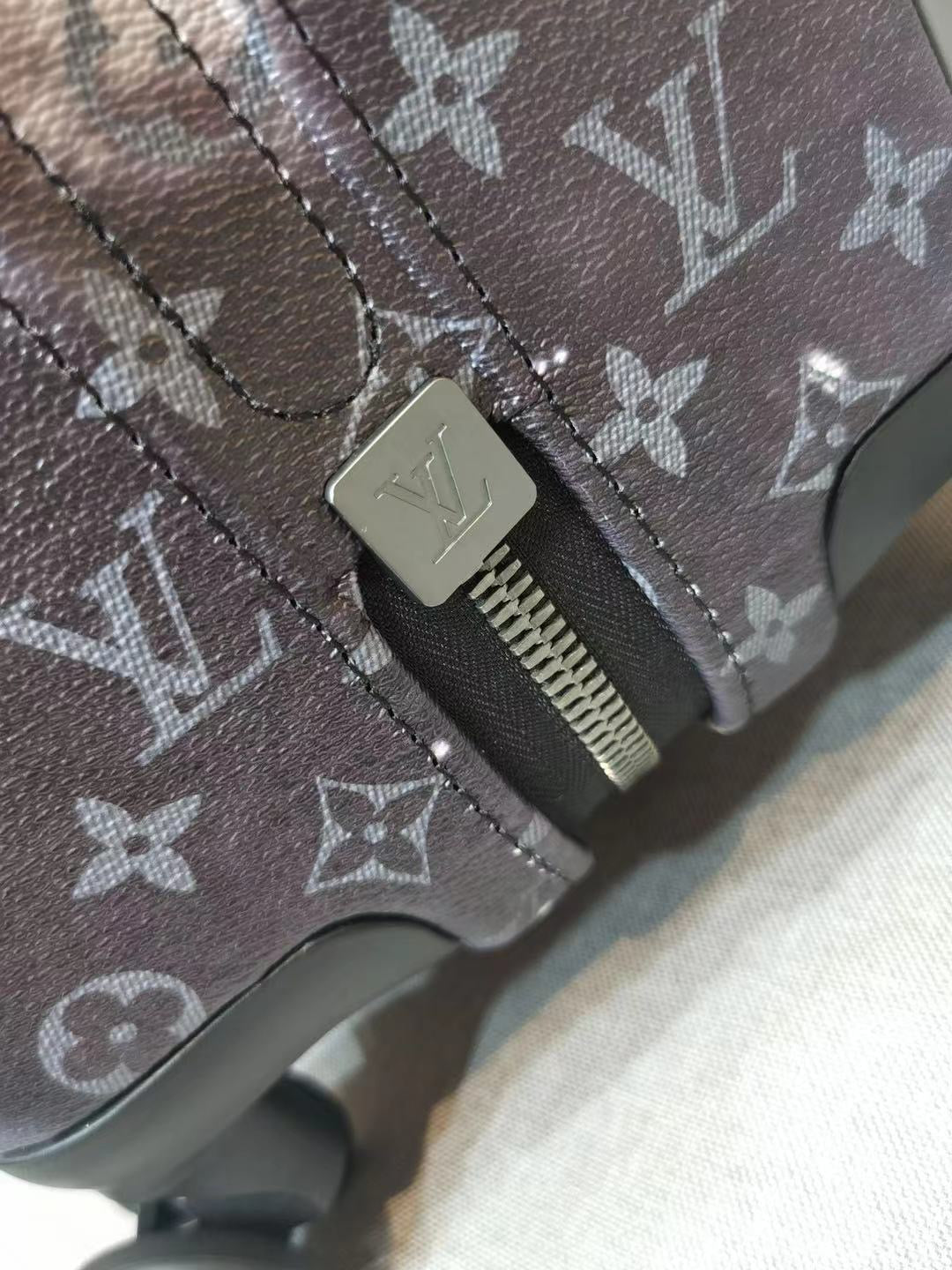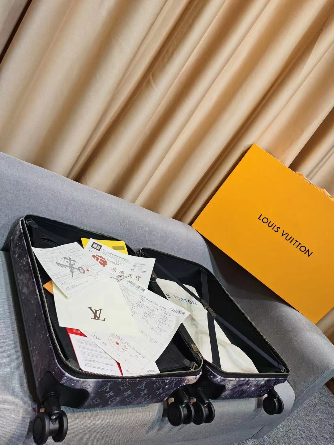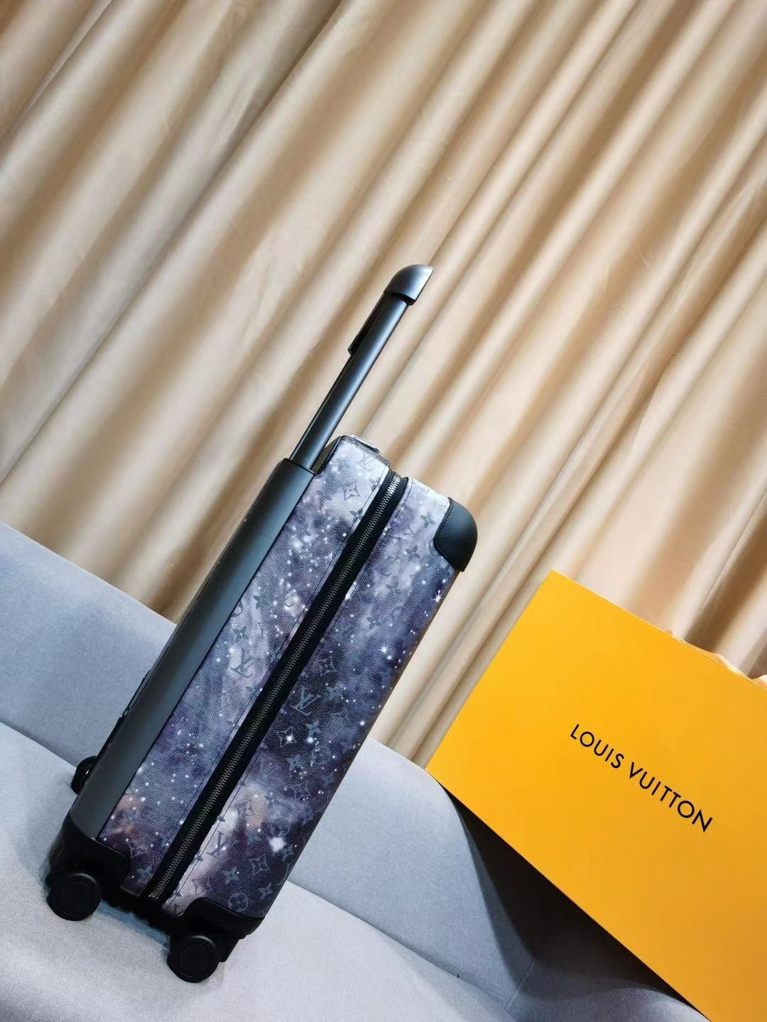 This Louis Vuitton Horizon Luggage Limited Edition Monogram Galaxy Canvas 55, crafted in black monogram galaxy coated canvas, features black leather handles, pull and roller mechanisms, and gunmetal-tone hardware. Its zip closure opens to a black nylon and fabric interior.