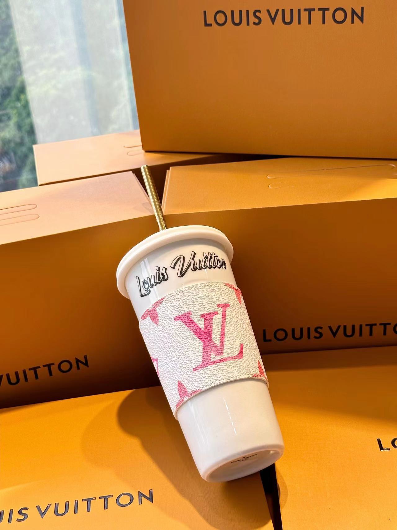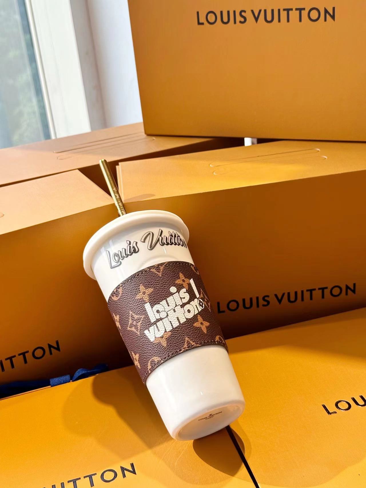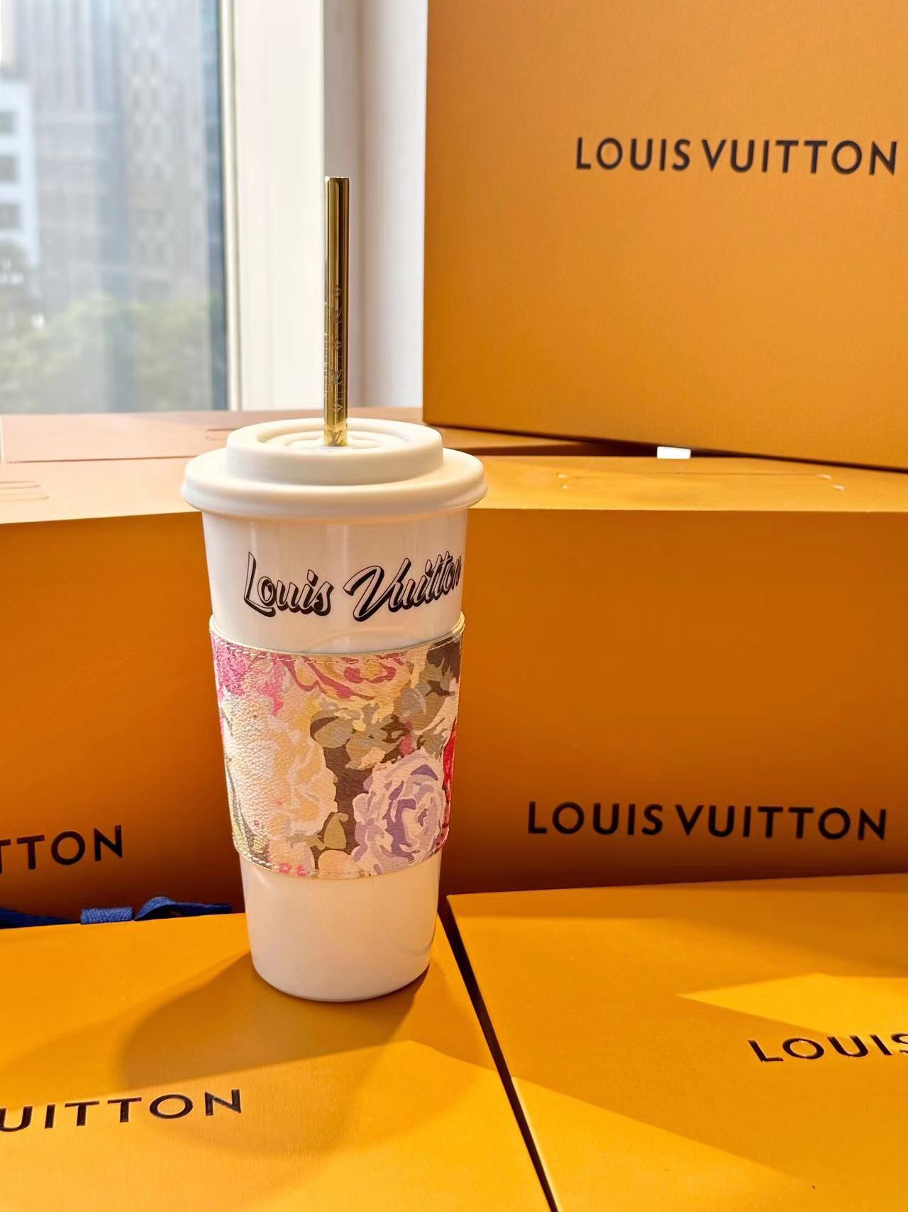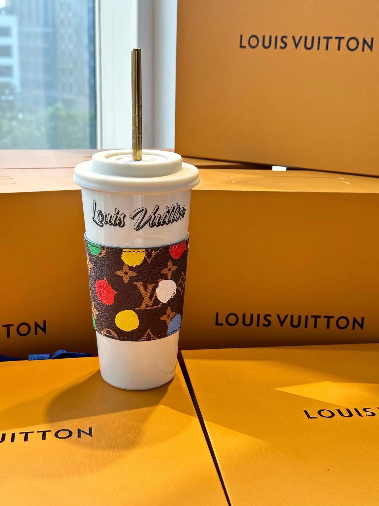 The LV Cup & Straw are designed for enjoying hot and cold drinks on the go. The reusable porcelain cup bears the LV Circle signature and comes with a removable silicone lid and a giant straw decorated with the Monogram pattern. The Monogram-canvas sleeve is both stylish and practical, making the cup easy and comfortable to carry.