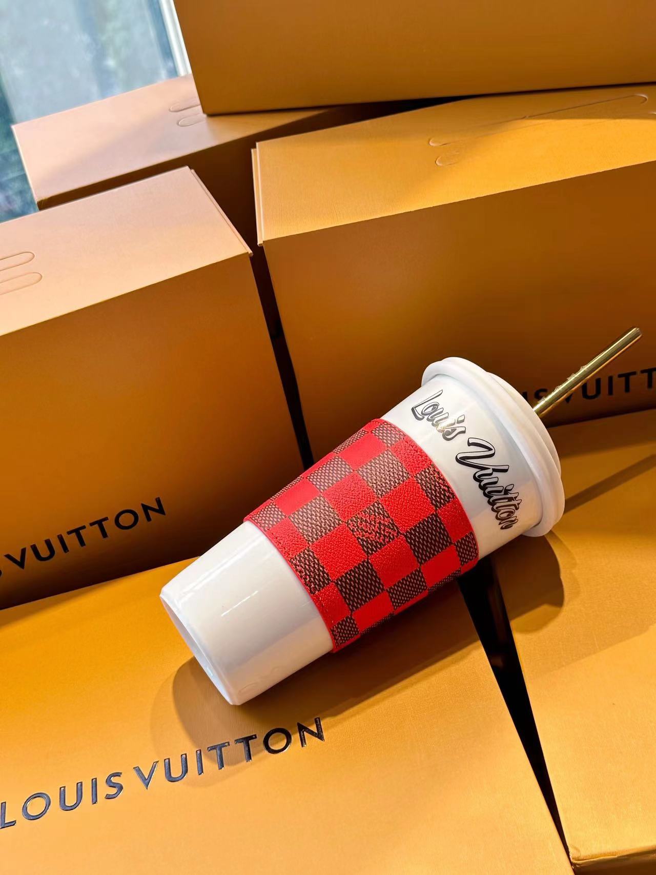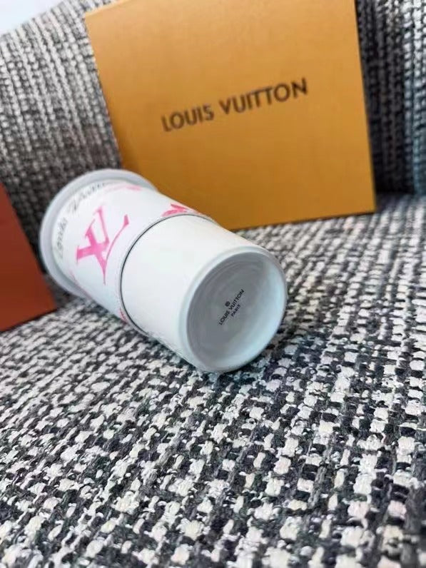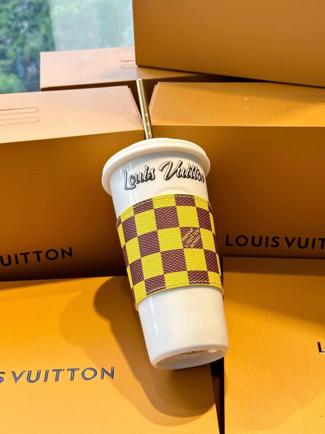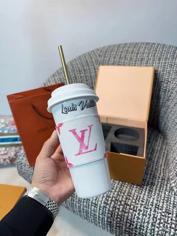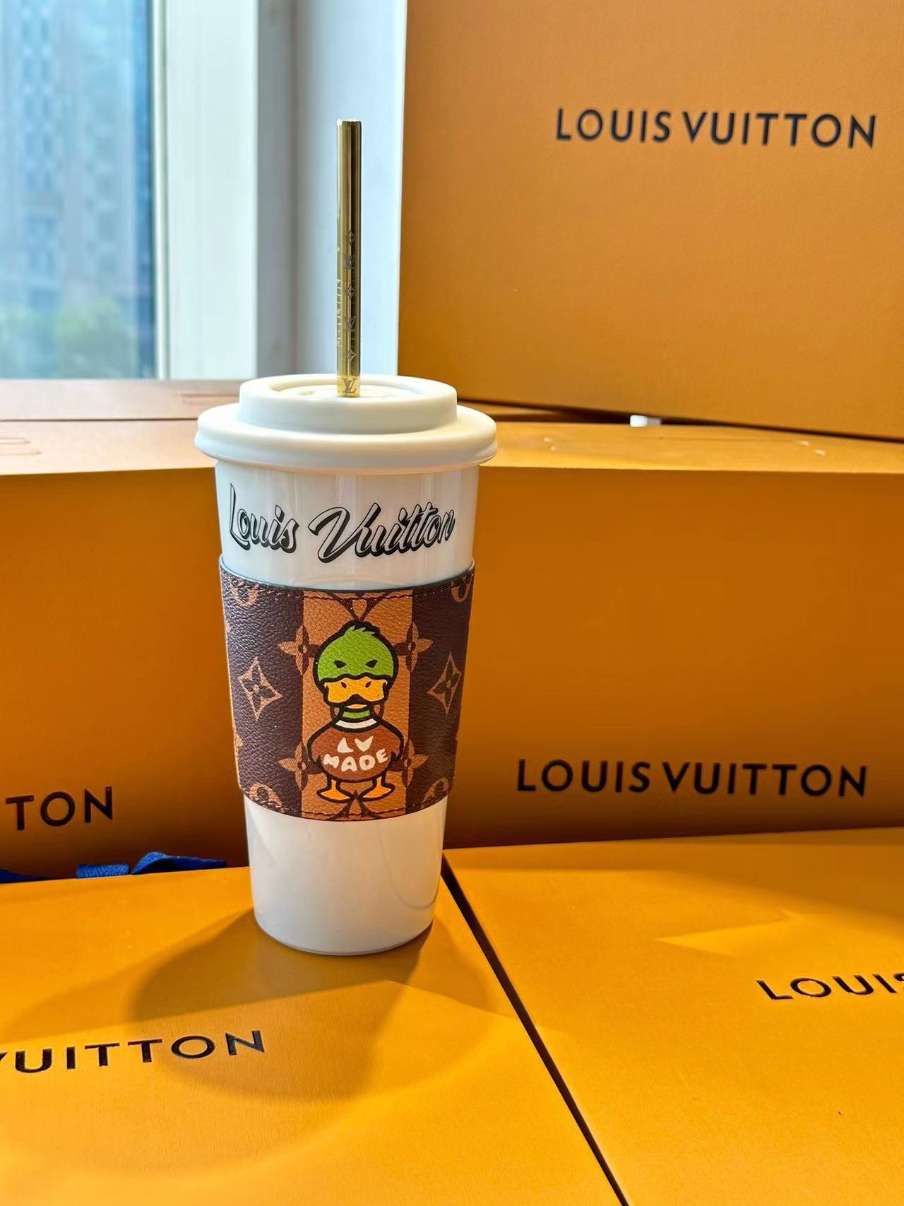 The LV Cup & Straw are designed for enjoying hot and cold drinks on the go. The reusable porcelain cup bears the LV Circle signature and comes with a removable silicone lid and a giant straw decorated with the Monogram pattern. The Monogram-canvas sleeve is both stylish and practical, making the cup easy and comfortable to carry.