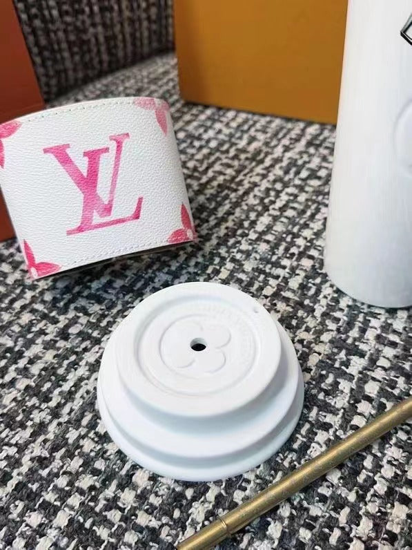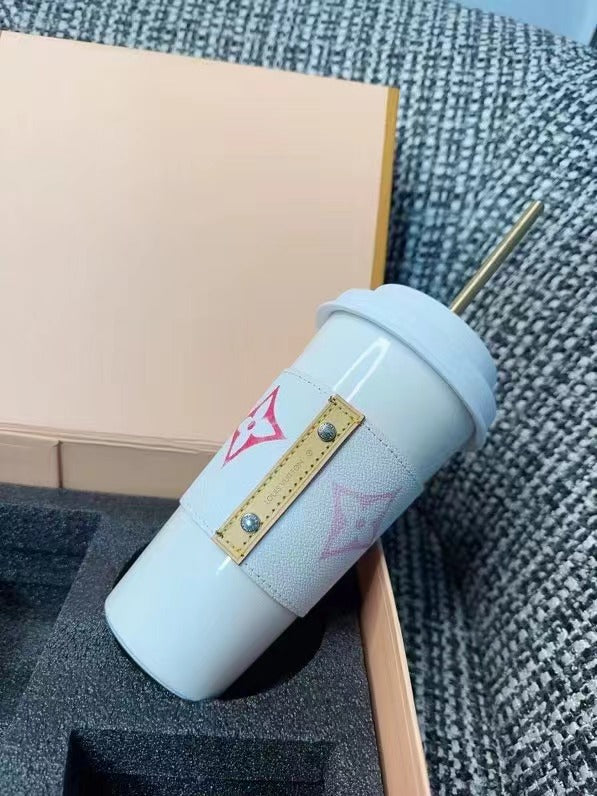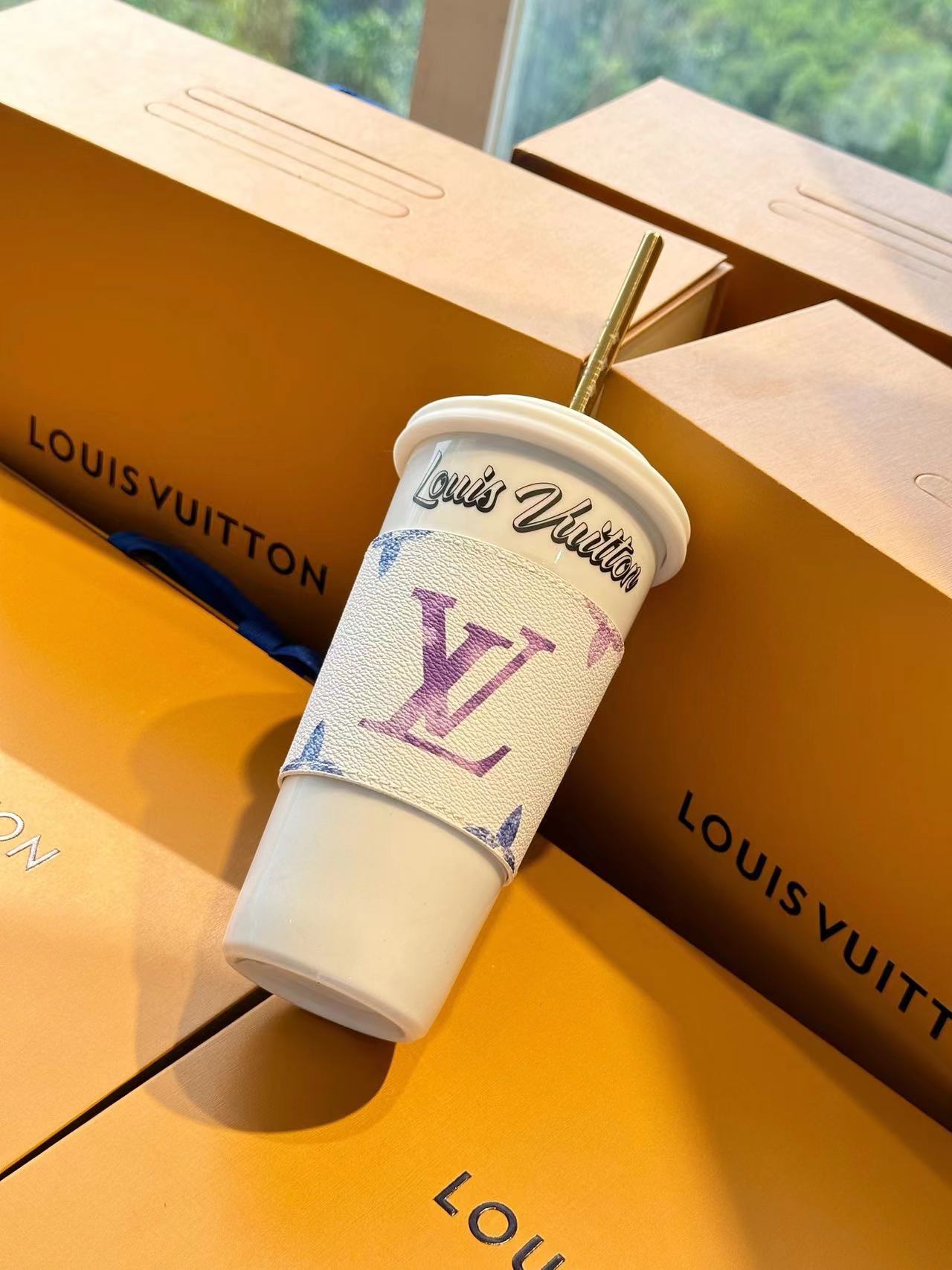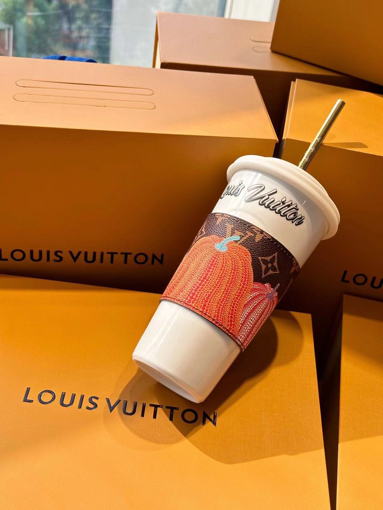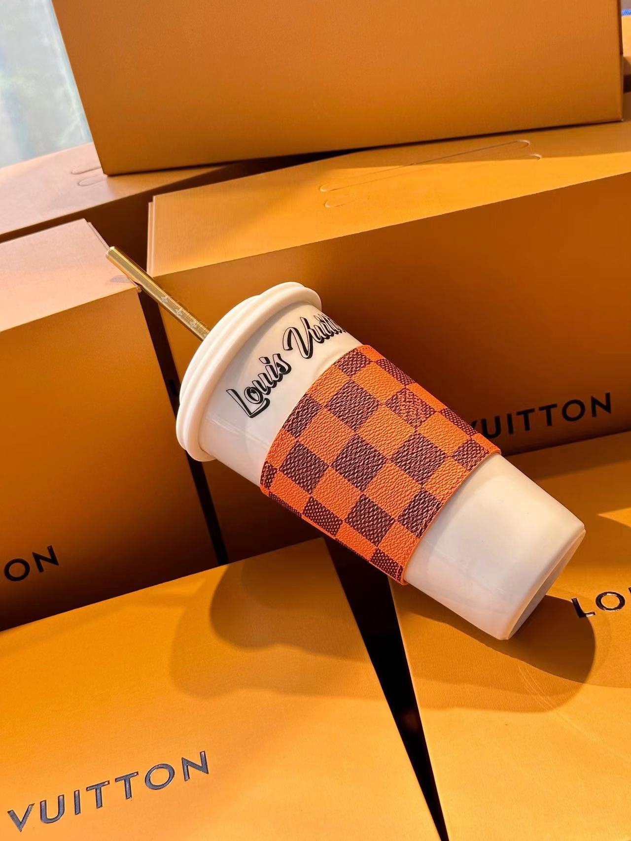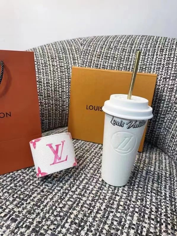 The LV Cup & Straw are designed for enjoying hot and cold drinks on the go. The reusable porcelain cup bears the LV Circle signature and comes with a removable silicone lid and a giant straw decorated with the Monogram pattern. The Monogram-canvas sleeve is both stylish and practical, making the cup easy and comfortable to carry.