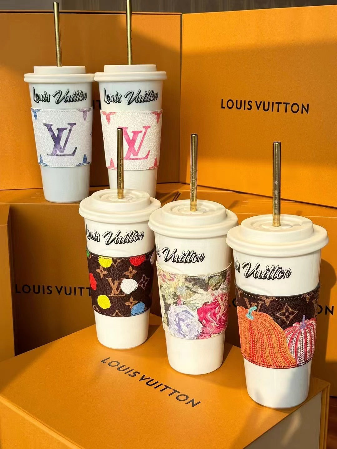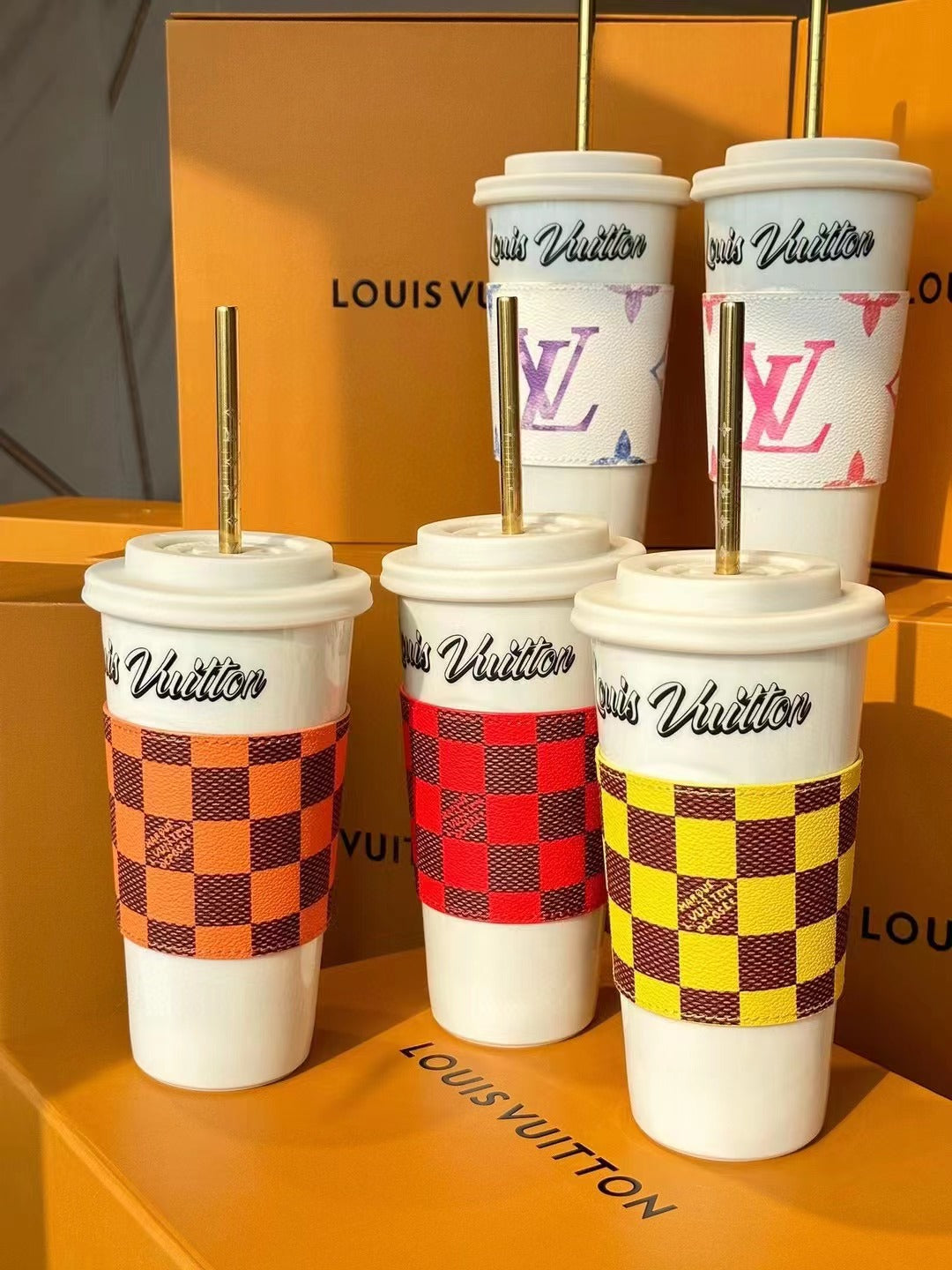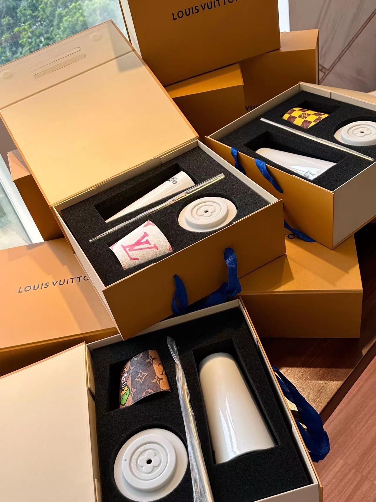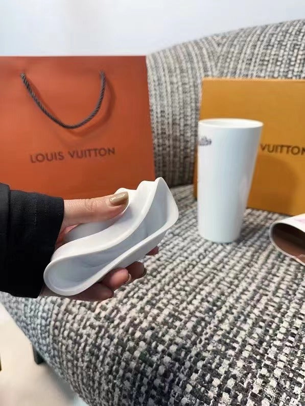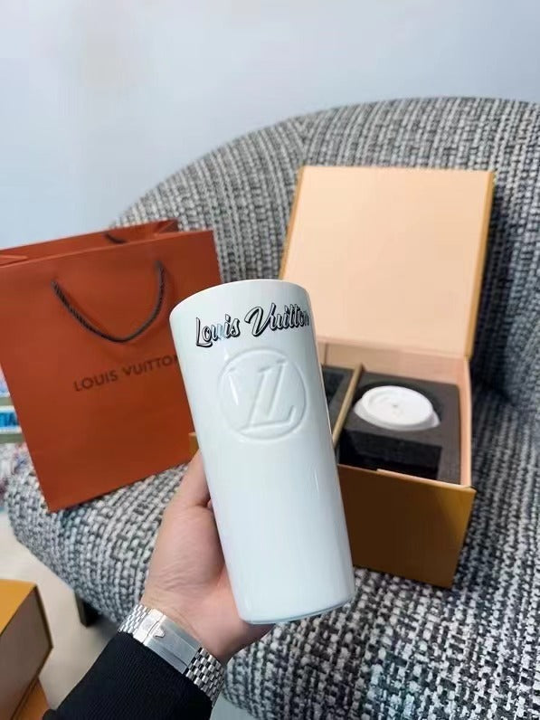 The LV Cup & Straw are designed for enjoying hot and cold drinks on the go. The reusable porcelain cup bears the LV Circle signature and comes with a removable silicone lid and a giant straw decorated with the Monogram pattern. The Monogram-canvas sleeve is both stylish and practical, making the cup easy and comfortable to carry.