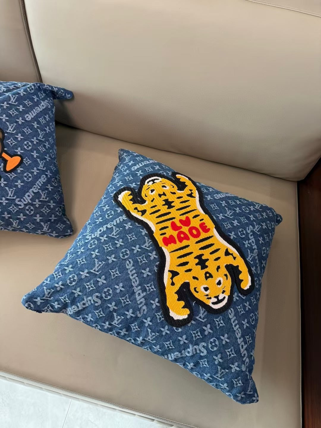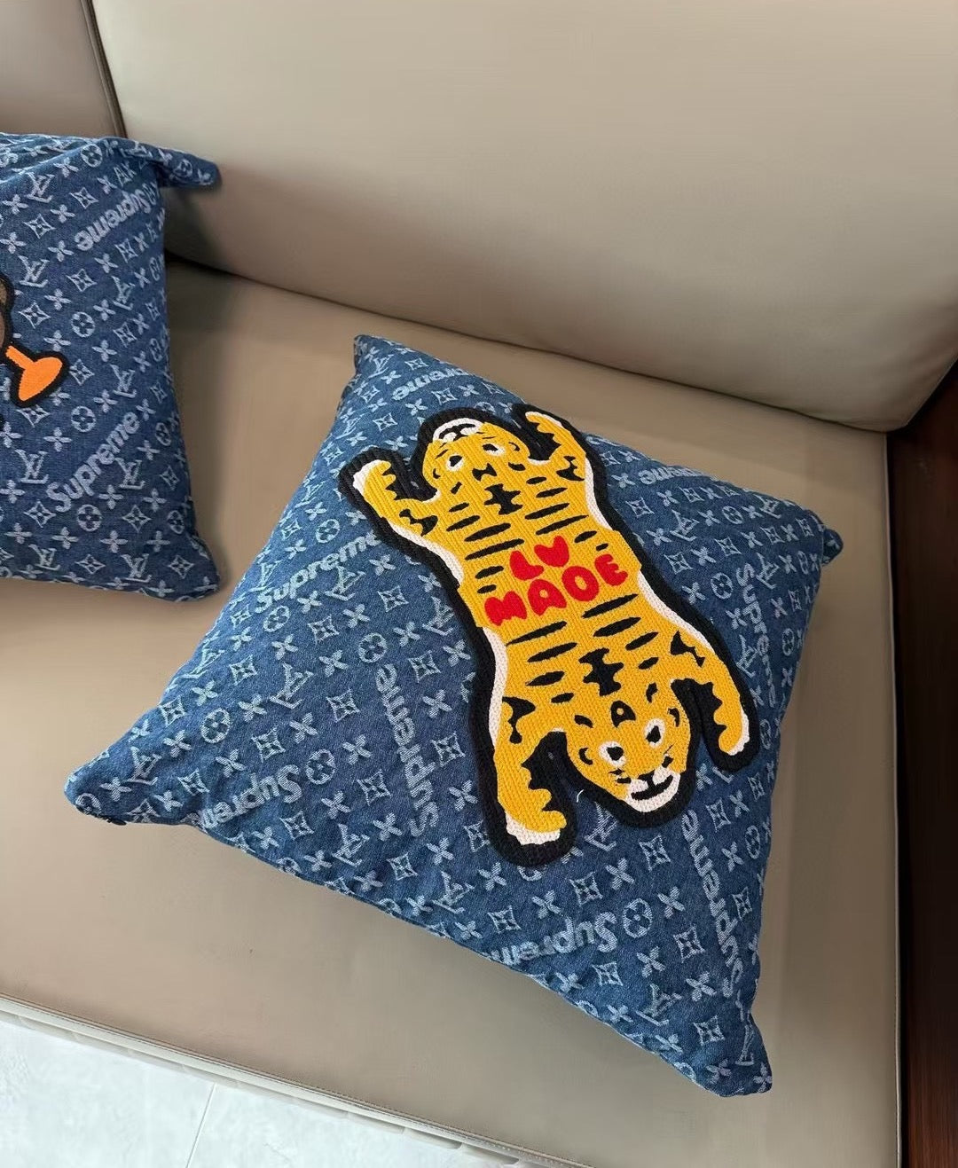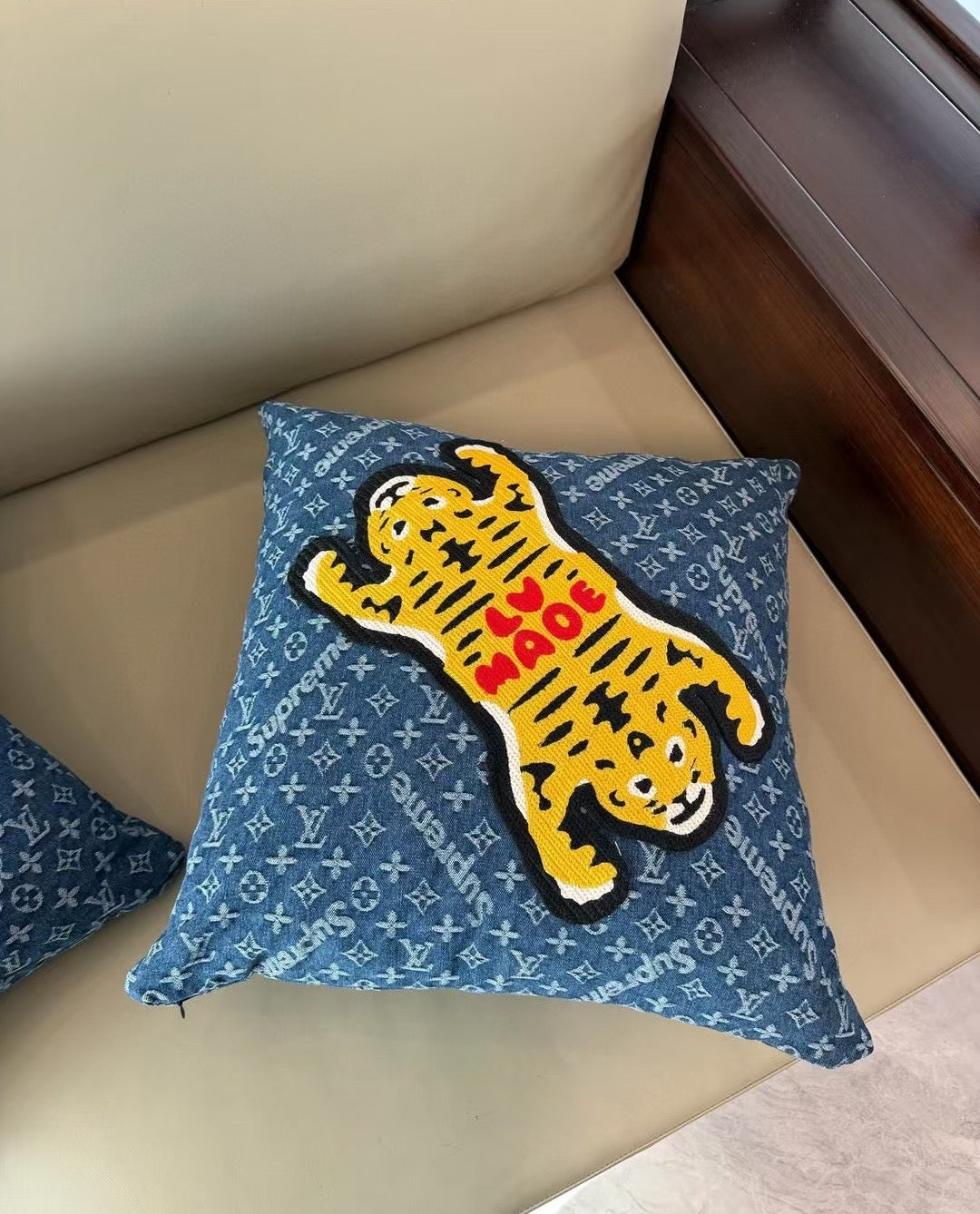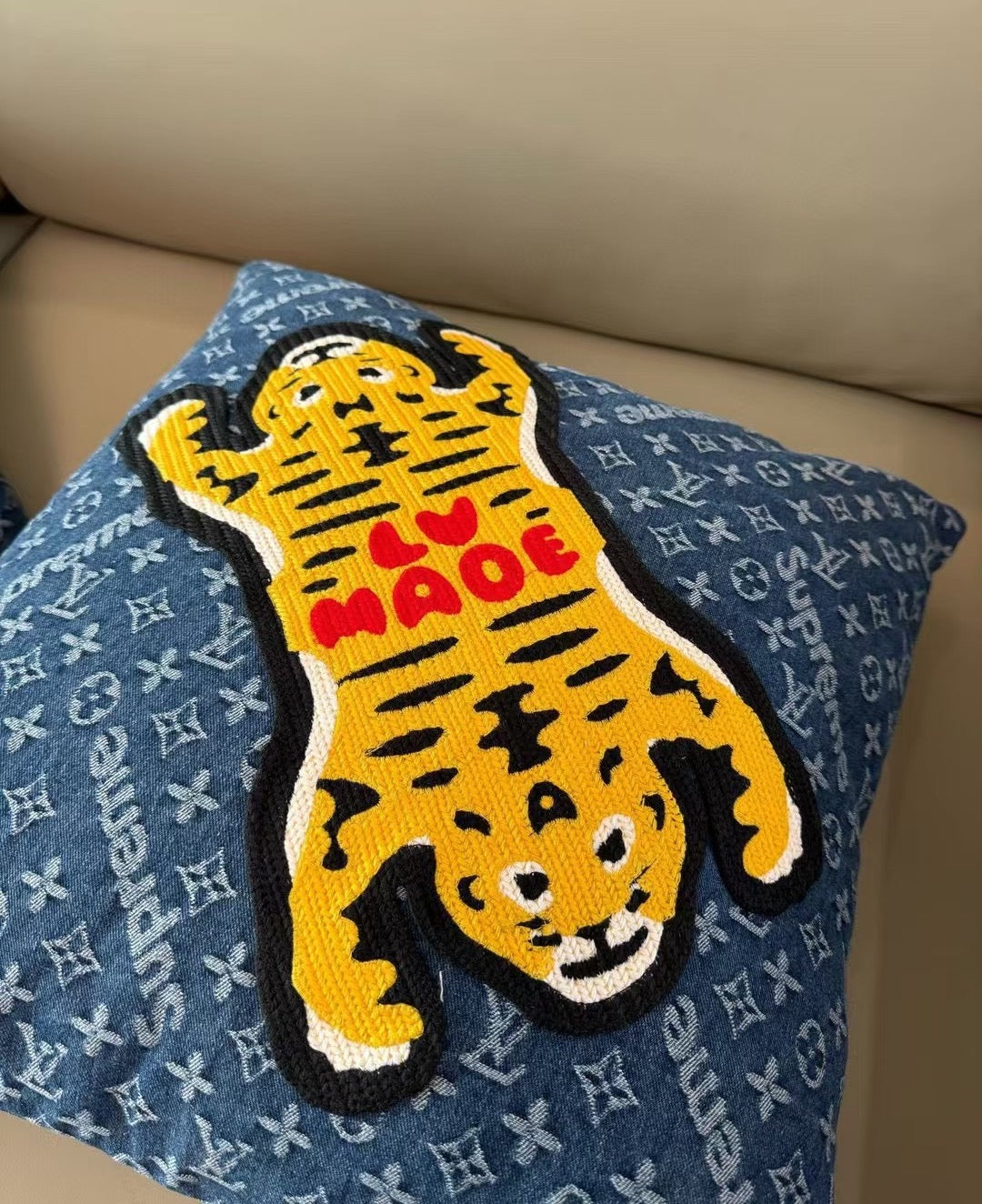 This unique pillow features an animal motif on the iconic LV denim print. Perfect for adding a touch of quirkiness and style to any room.