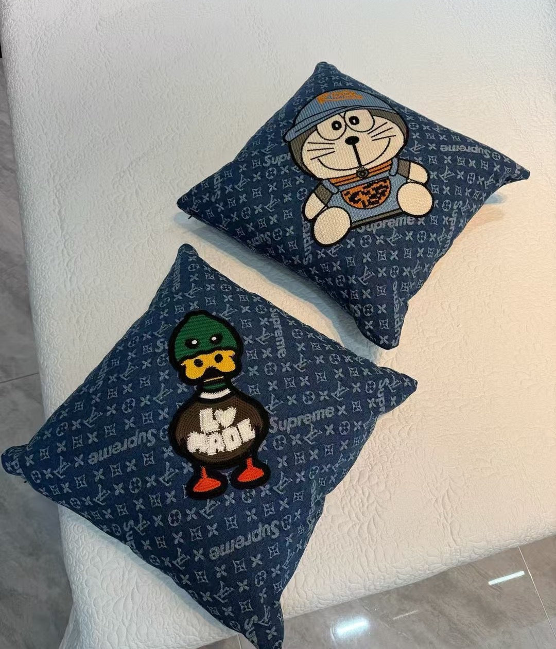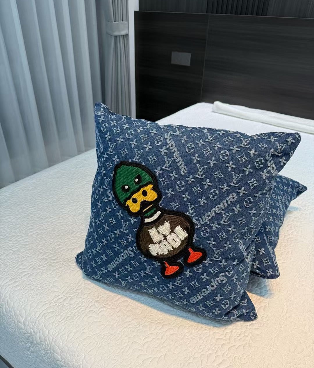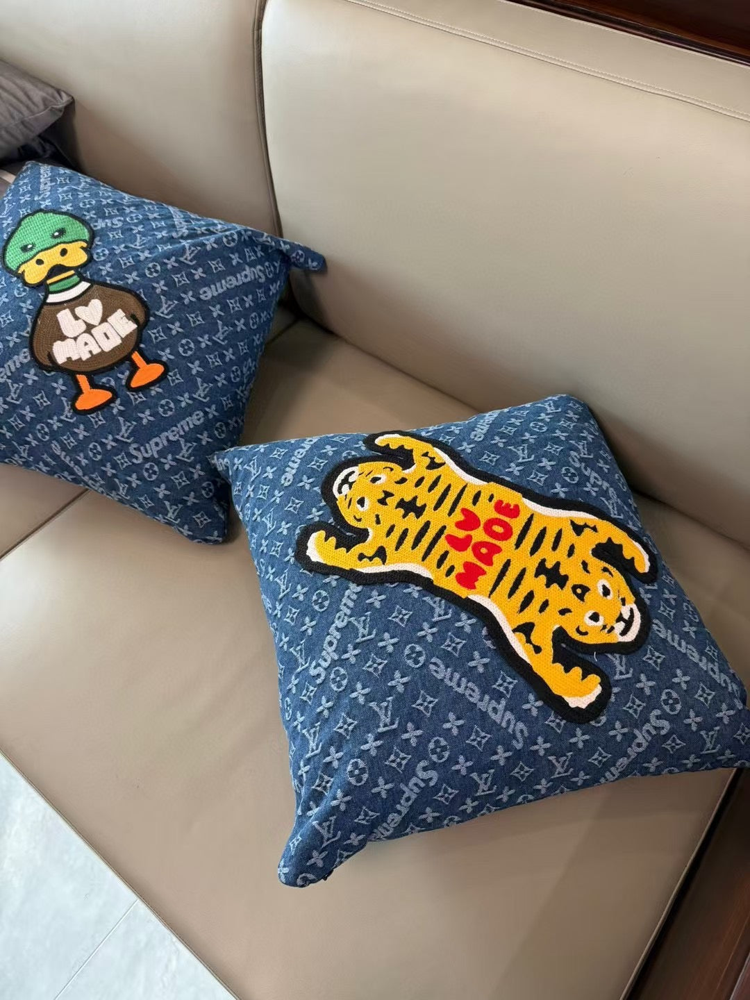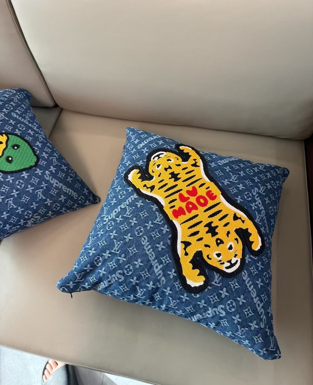 This unique pillow features an animal motif on the iconic LV denim print. Perfect for adding a touch of quirkiness and style to any room.