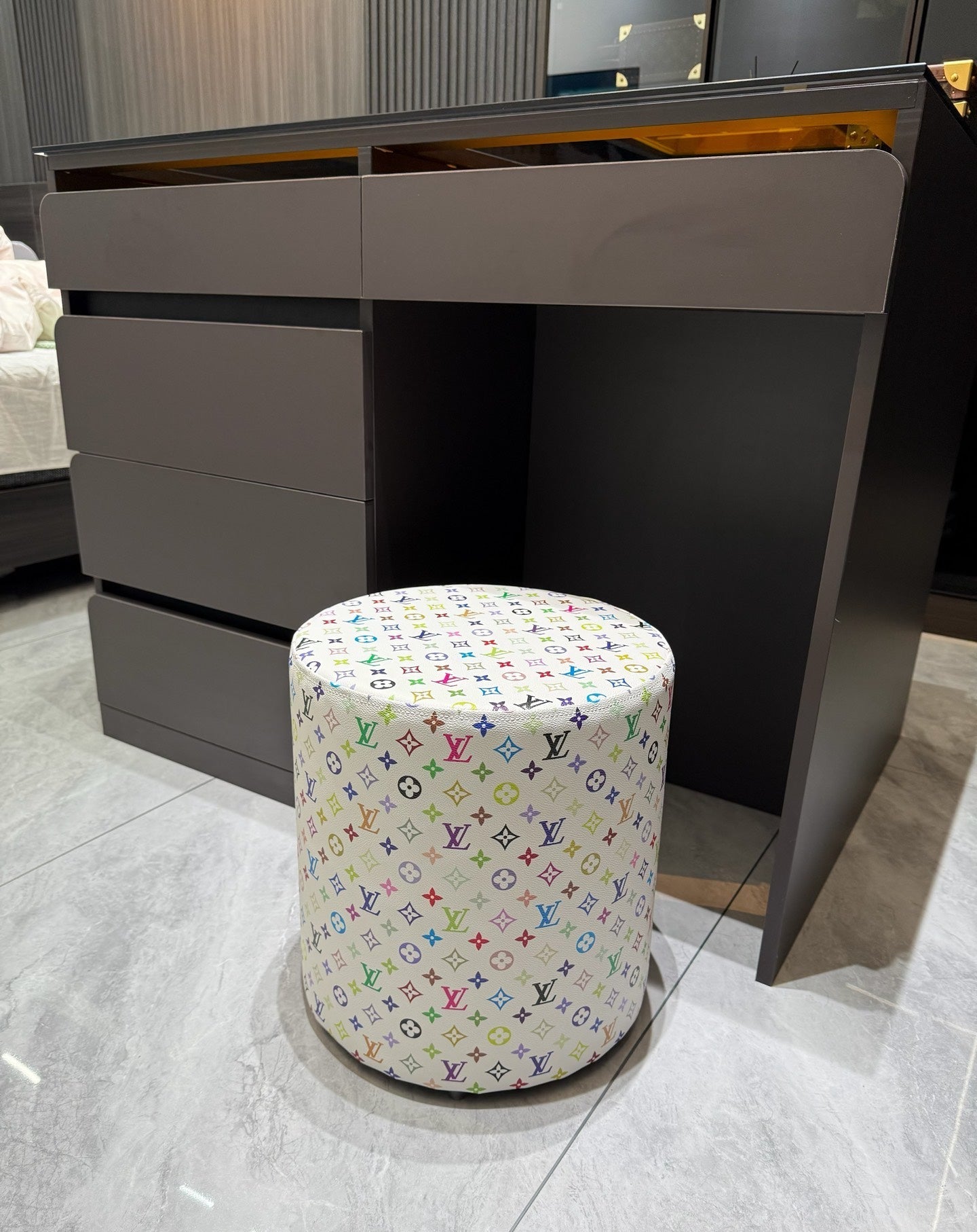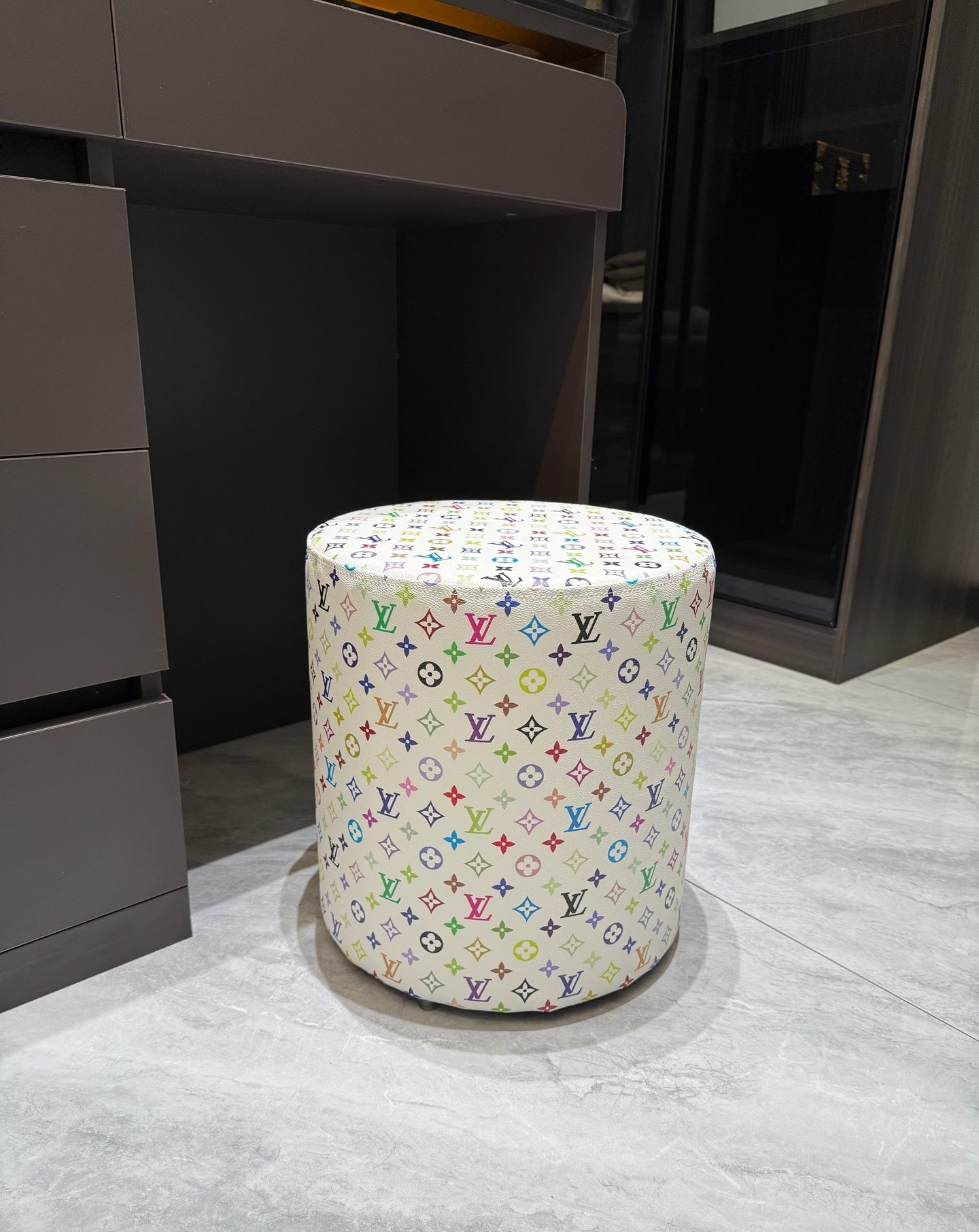 CUSTOM LV MULTICOLOUR OTTOMAN STOOL (WHITE) is now available for you to add a pop of colours and fun to your home.