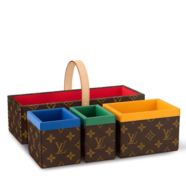 The new Robert toolbox brings together several of the Maison’s most iconic signatures. Made from Monogram canvas with a handle of edge-dyed VGV leather and engraved gold-tone rivets, it is fitted with removable compartments in the season’s vibrant hues. Both decorative and useful, this portable piece will keep a work table tidy in colorful style.