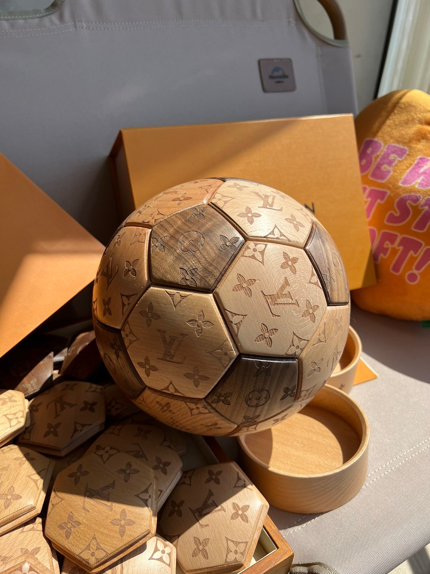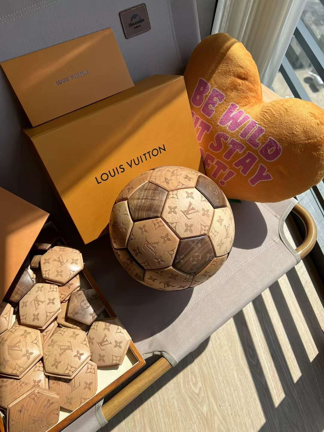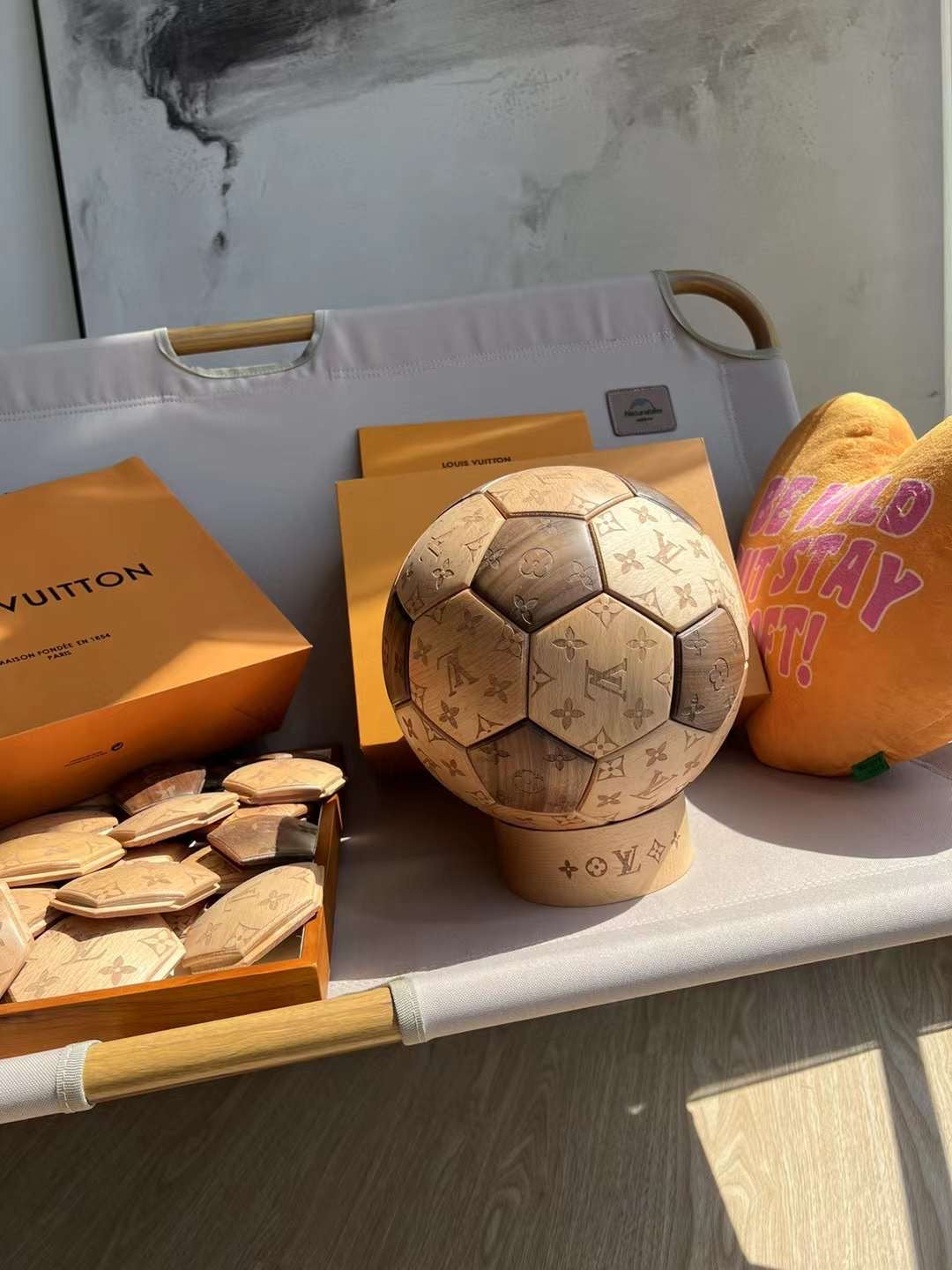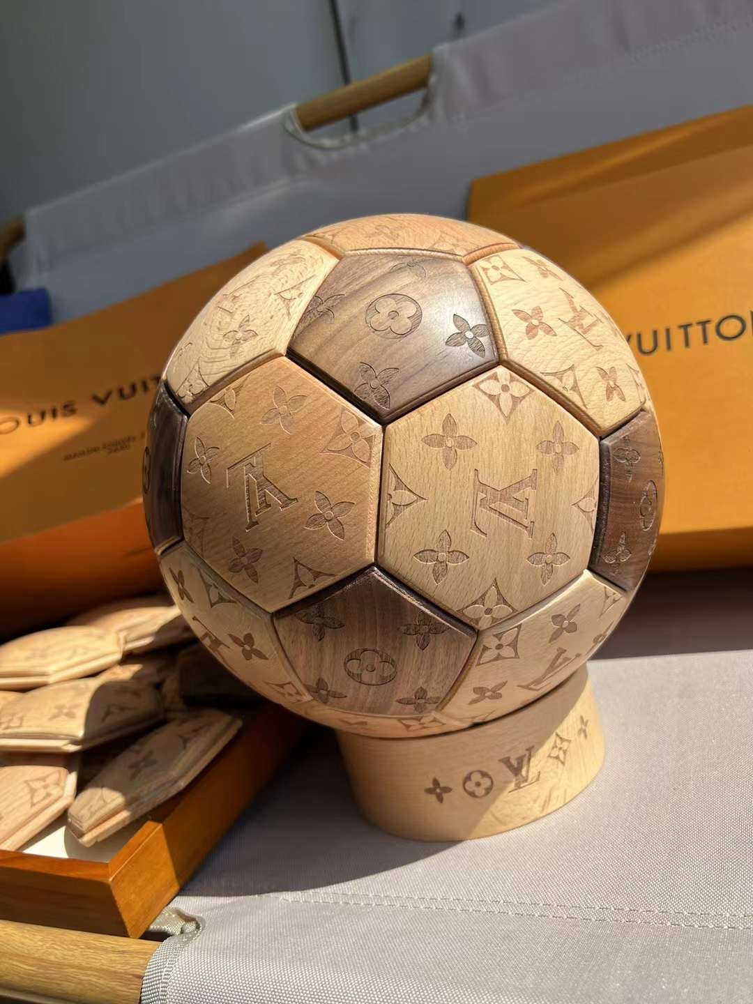 CUSTOM LV SOCCER BALL DISPLAY is now available, featuring its iconic monogram logo.