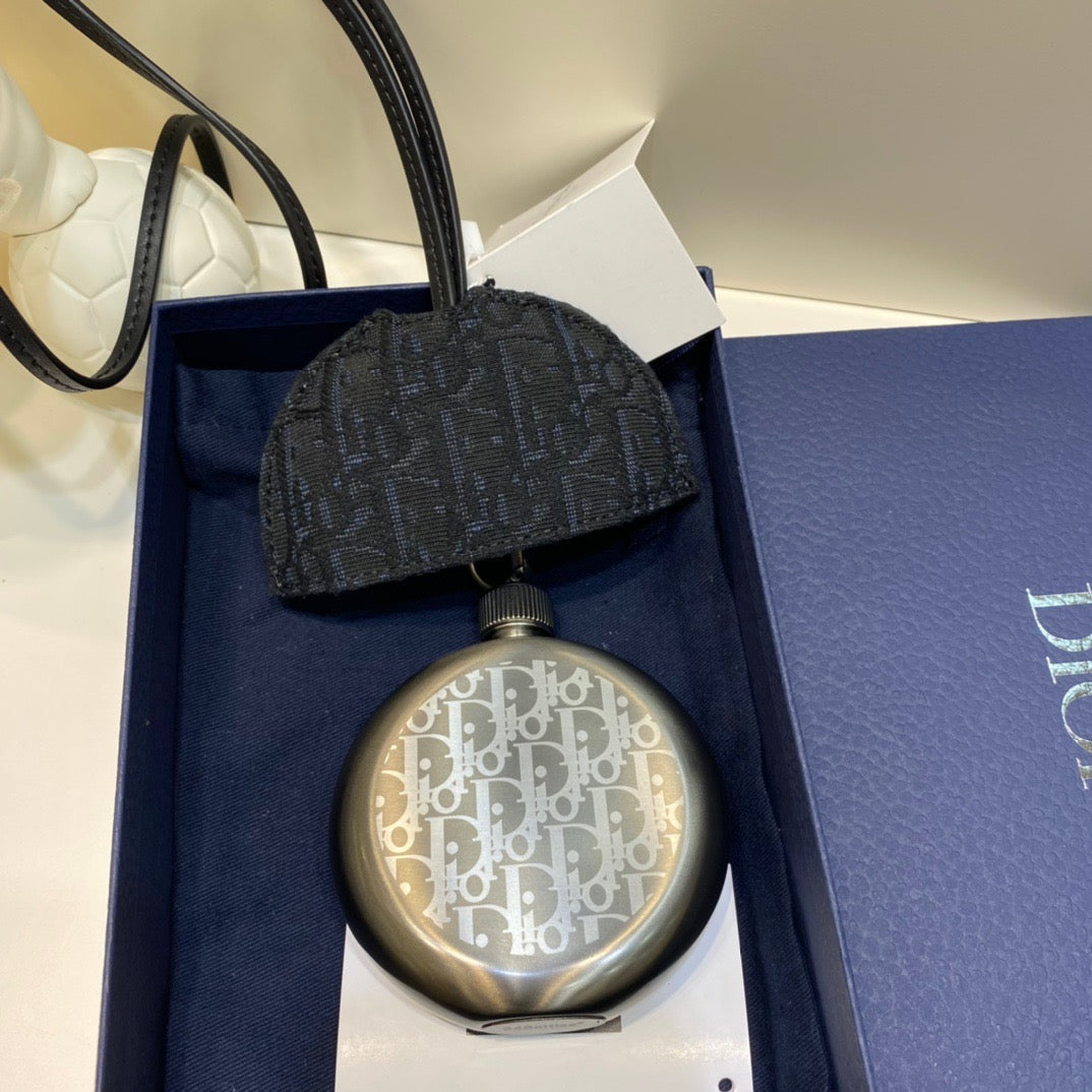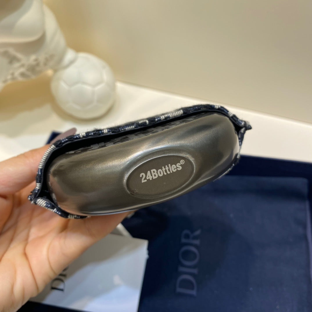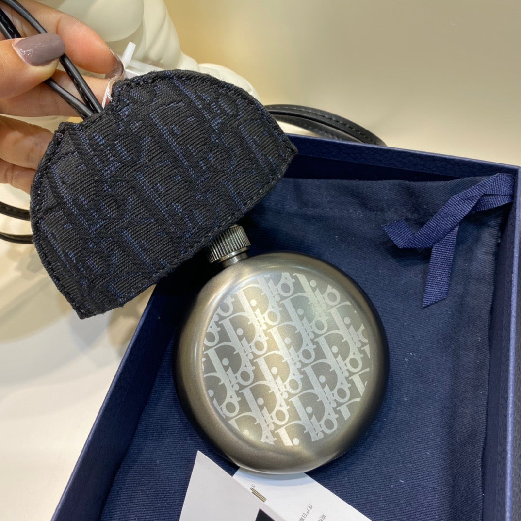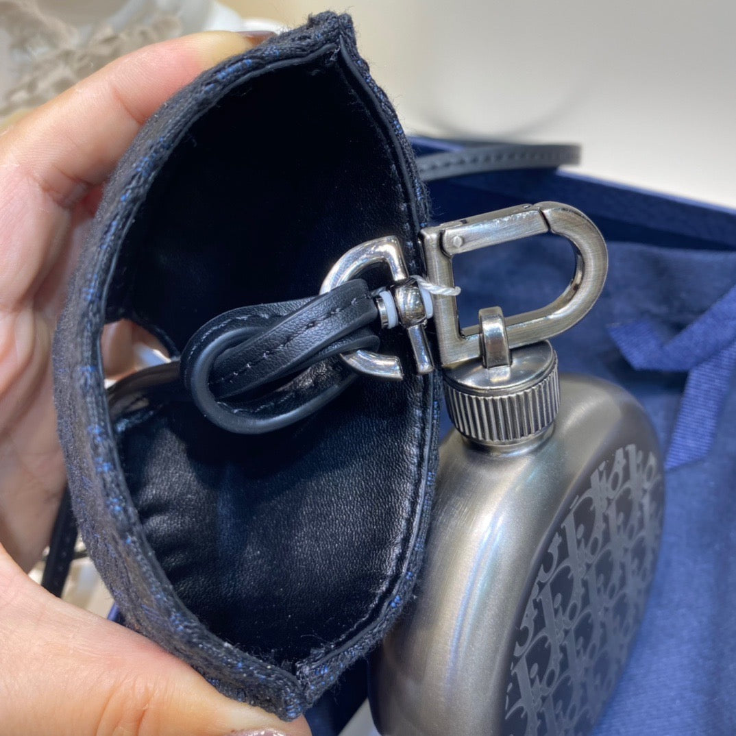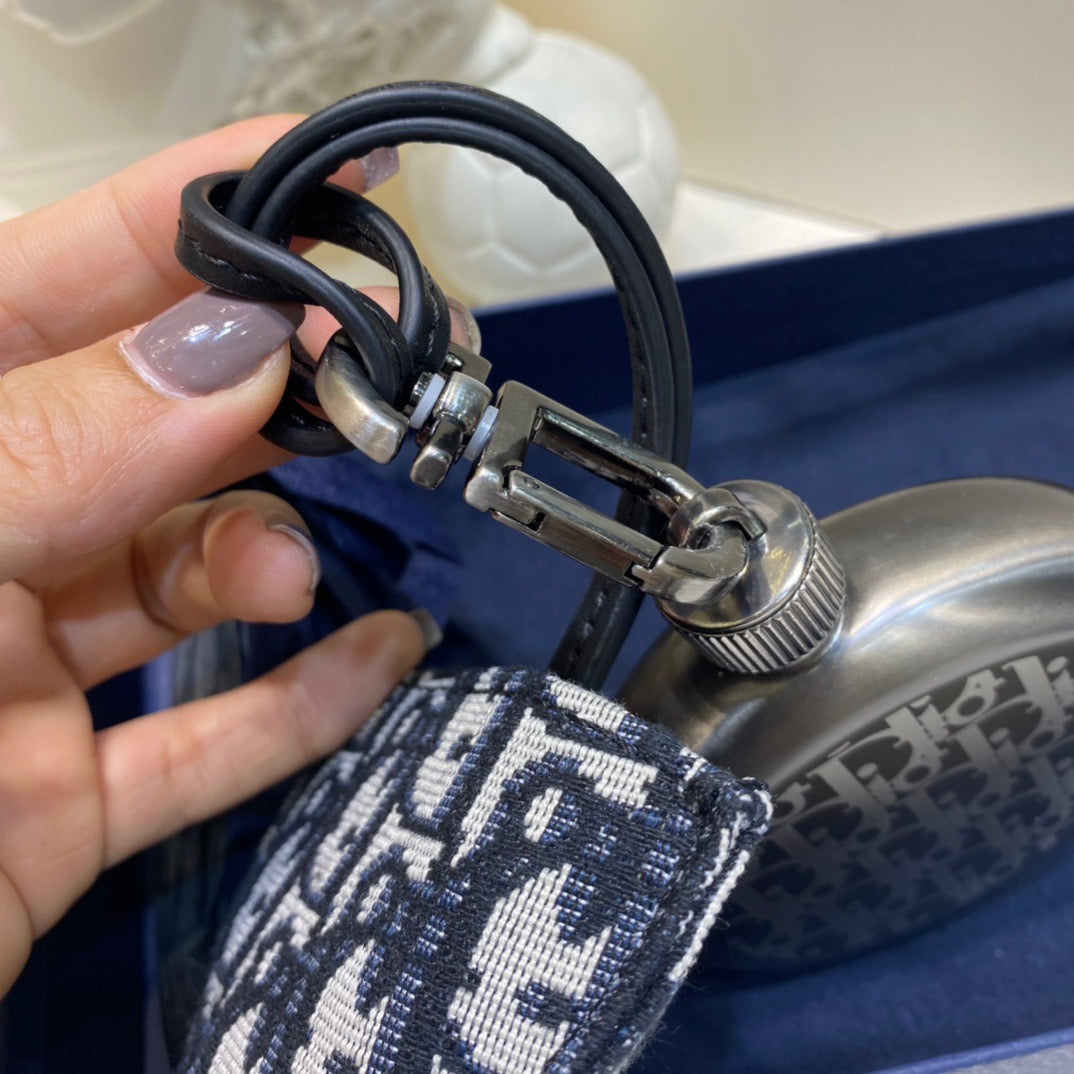 The Dior Aqua flask is an exceptionally modern and elegant accessory. Crafted in stainless steel, the flask is enhanced by a black Dior Oblique jacquard holder. It can be attached to a belt loop thanks to the 'DIOR'-engraved ring, or worn around the neck with its removable smooth calfskin shoulder strap.