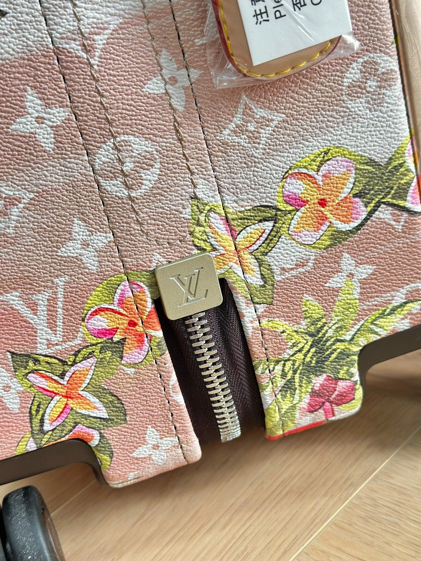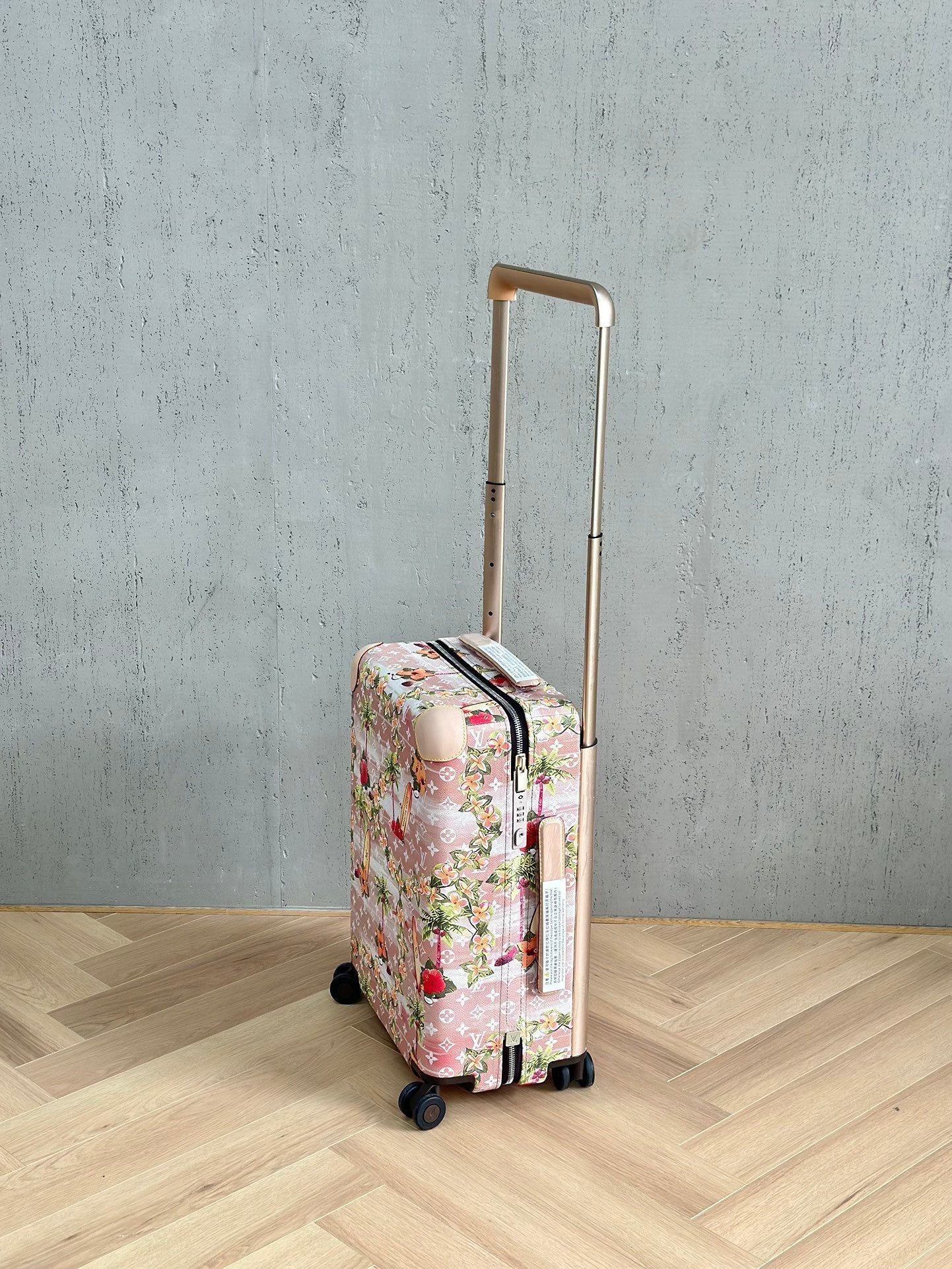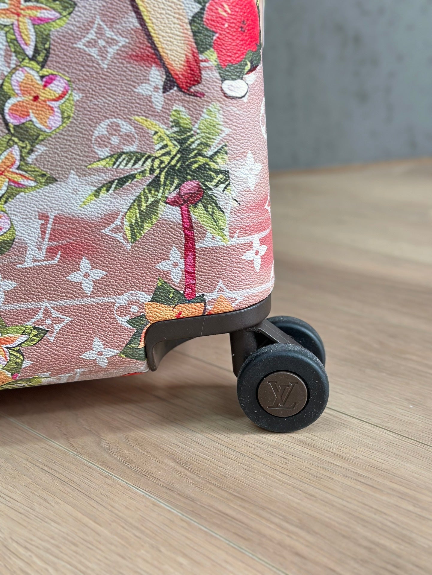 The Horizon 55 rolling suitcase is made from Monogram Surfin’ canvas, with Pharrell Williams’ summery new print. The intricate motif includes palm trees, coconuts, hibiscus and Monogram Flowers, and surfboards. Small enough to be used as carry-on luggage, it’s unexpectedly spacious inside thanks to its external cane.