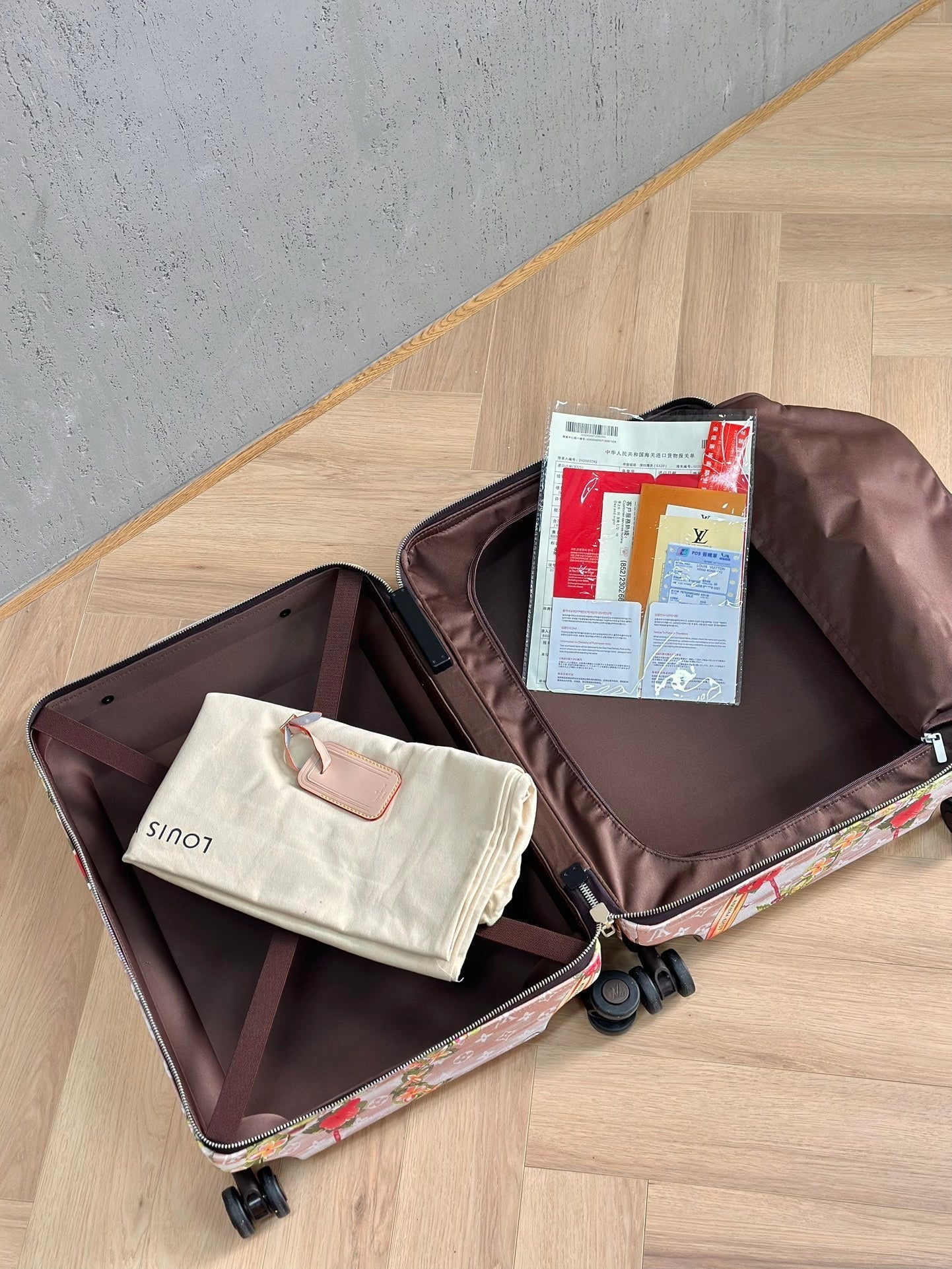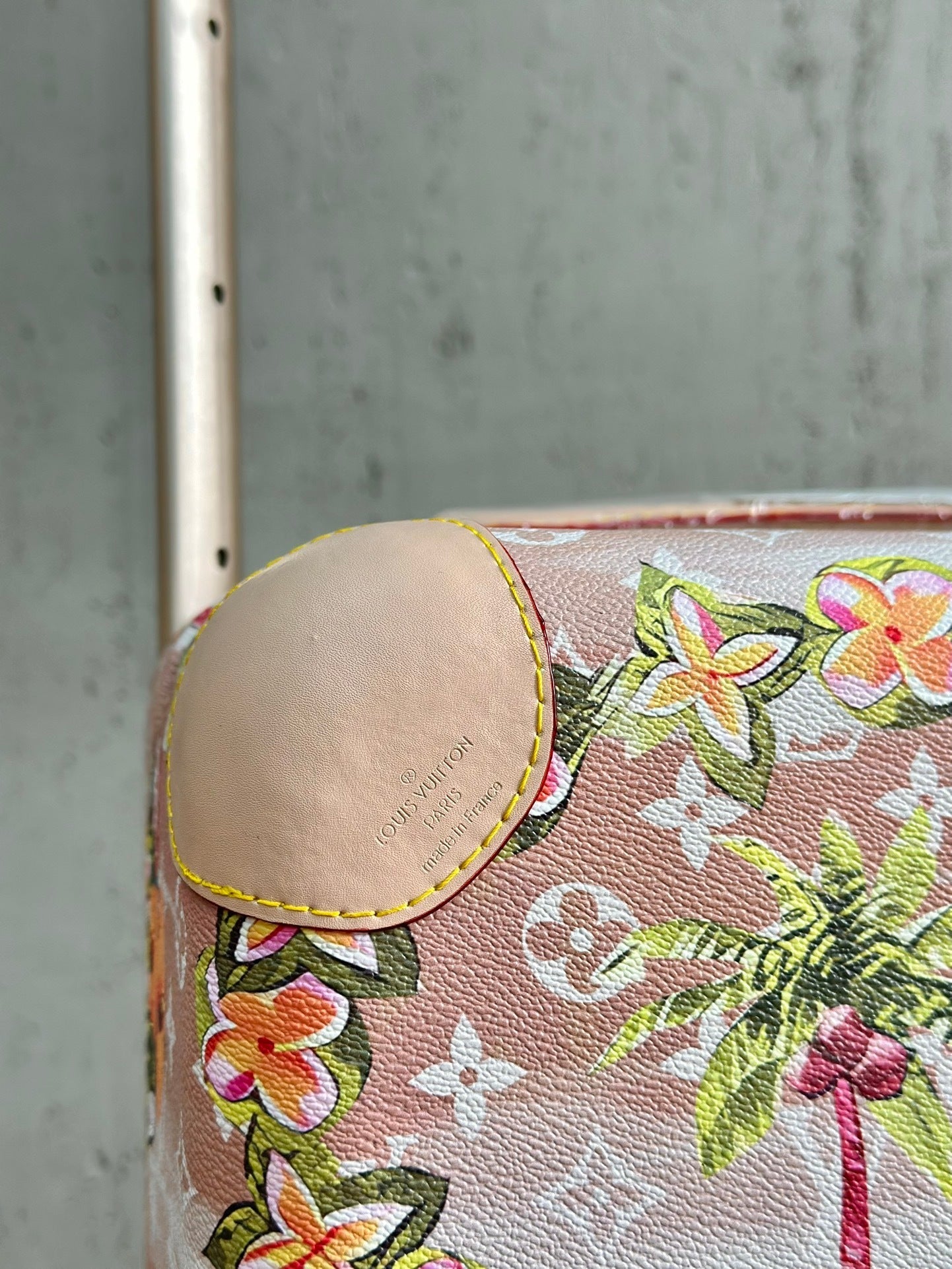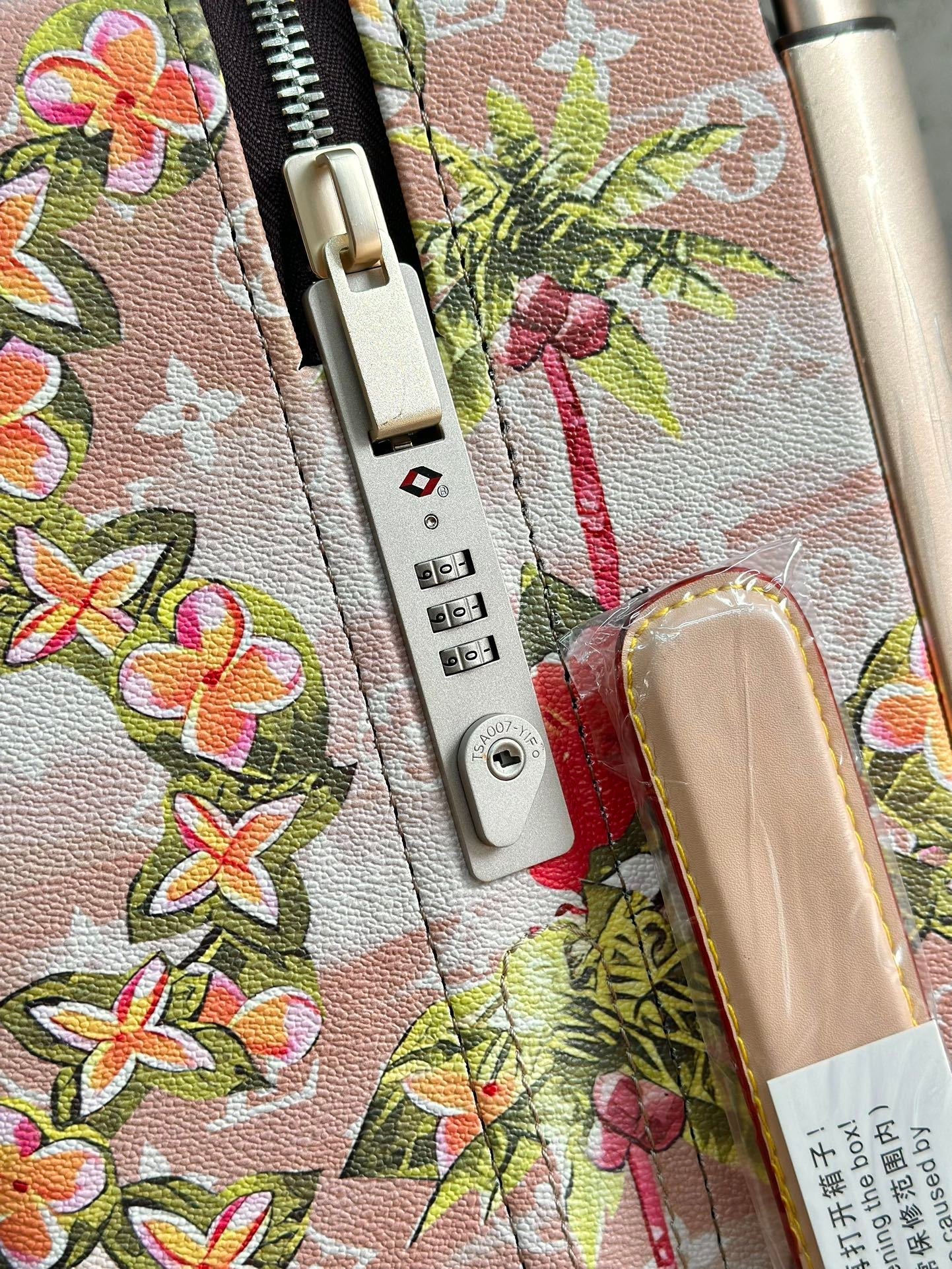 The Horizon 55 rolling suitcase is made from Monogram Surfin’ canvas, with Pharrell Williams’ summery new print. The intricate motif includes palm trees, coconuts, hibiscus and Monogram Flowers, and surfboards. Small enough to be used as carry-on luggage, it’s unexpectedly spacious inside thanks to its external cane.