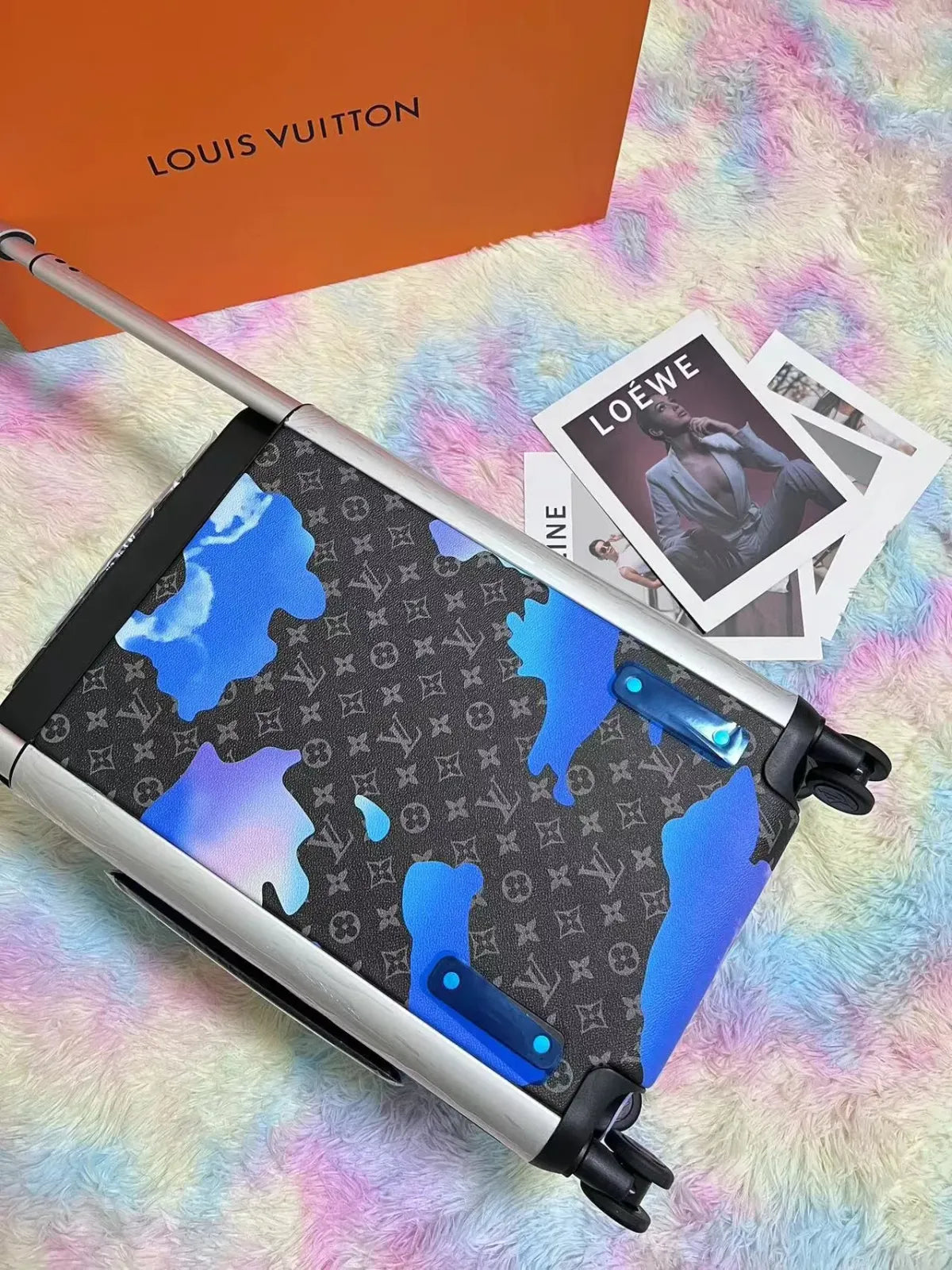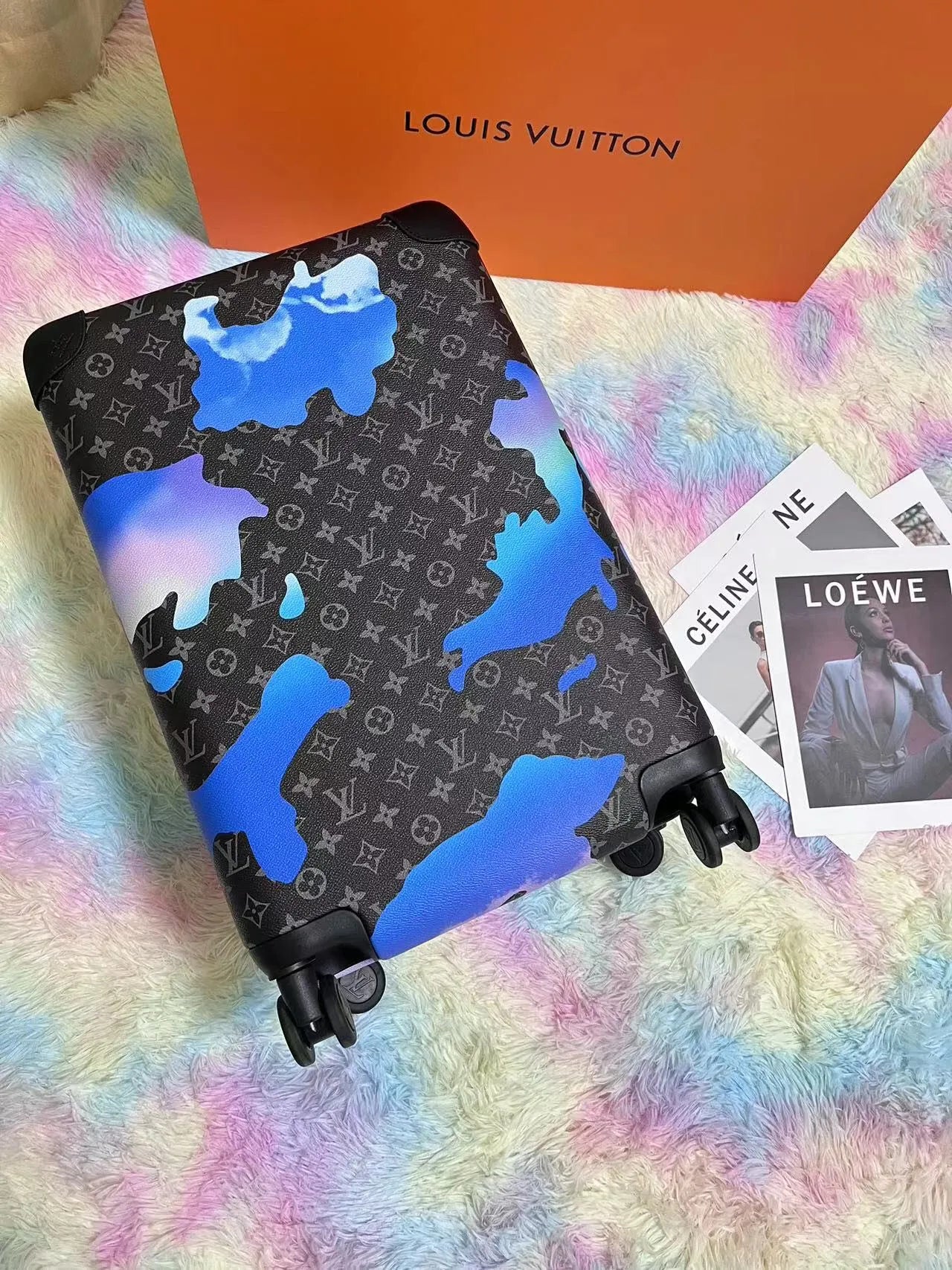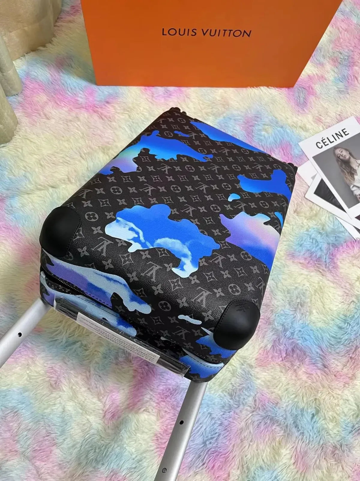 Louis Vuitton’s classic Horizon trolley bag expresses the inspiration of a new dawn as part of the “Room with a View” collection for year’s end 2022. Monogram Eclipse canvas is adorned with a stylized sunrise in gradations of blue and violet, with the “LV” signature evoked in the shapes of the clouds. An ultra-functional carry-on with a poetic, dreamlike look.