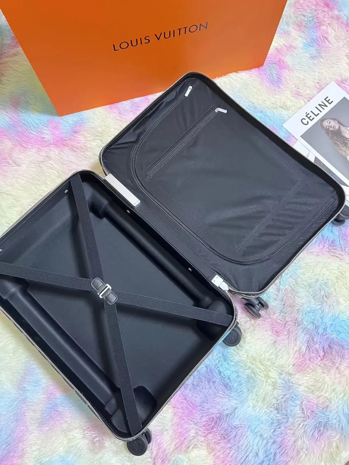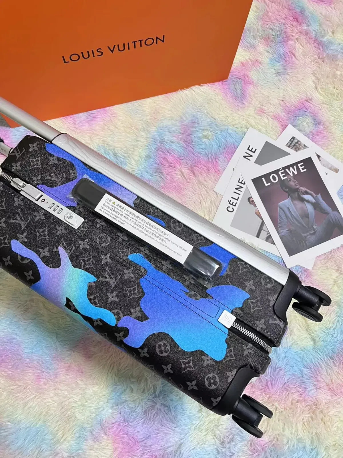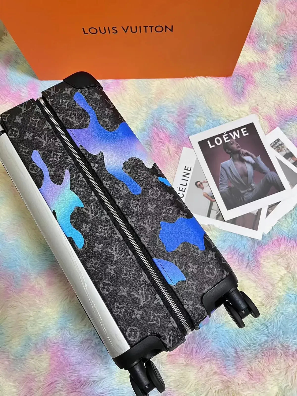 Louis Vuitton’s classic Horizon trolley bag expresses the inspiration of a new dawn as part of the “Room with a View” collection for year’s end 2022. Monogram Eclipse canvas is adorned with a stylized sunrise in gradations of blue and violet, with the “LV” signature evoked in the shapes of the clouds. An ultra-functional carry-on with a poetic, dreamlike look.