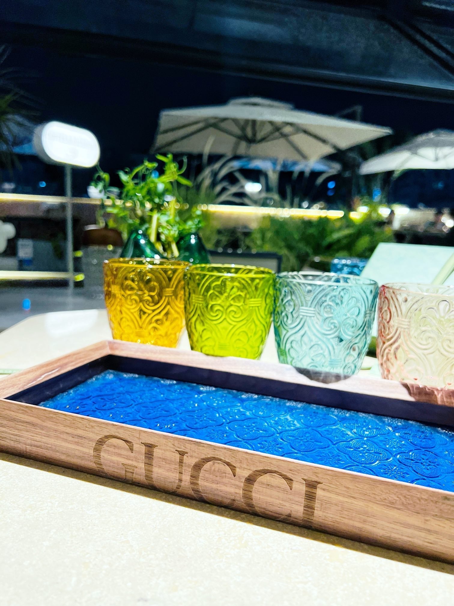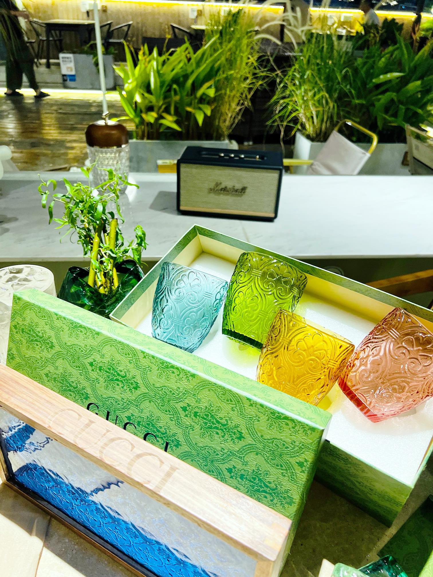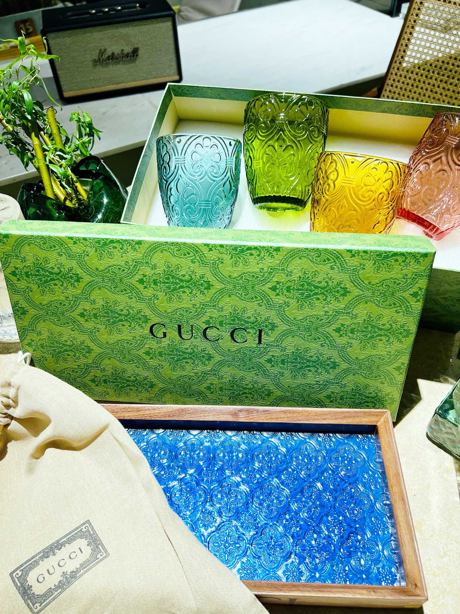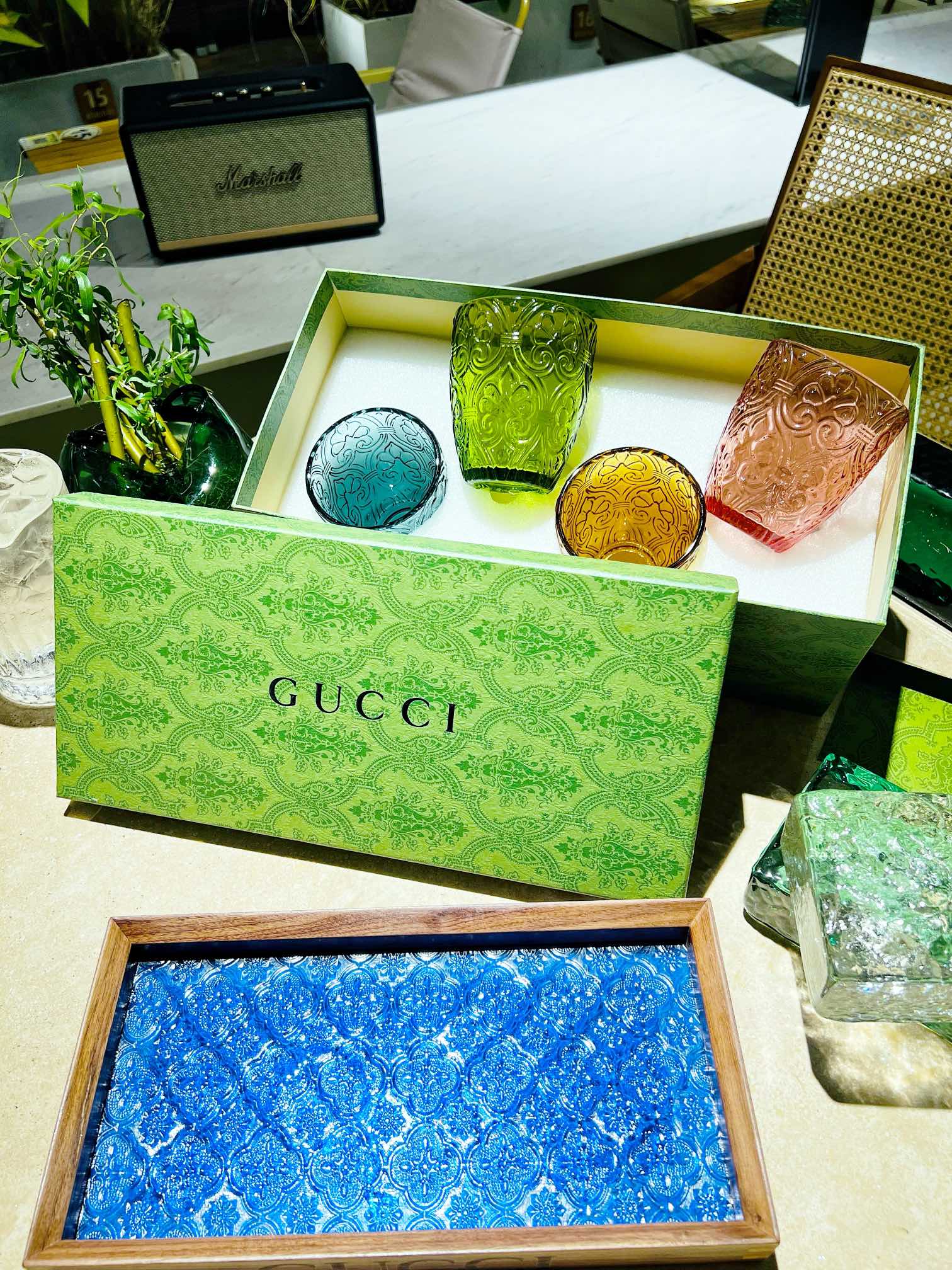 GUCCI GLASS AND TRAY SET is now available, giving you the chance to showcase everyday objects in its futuristic art style.