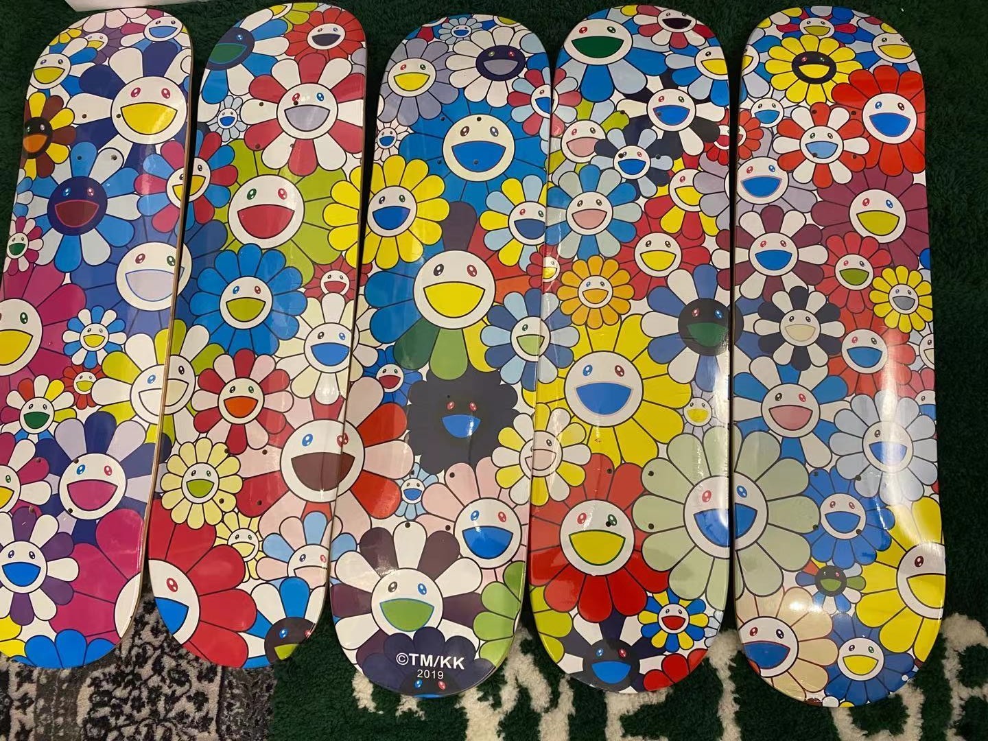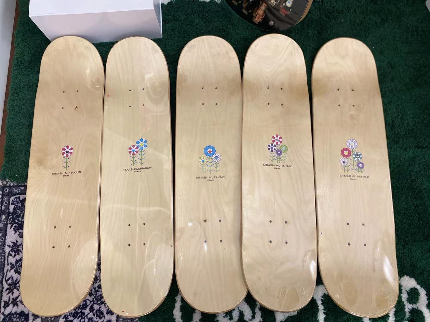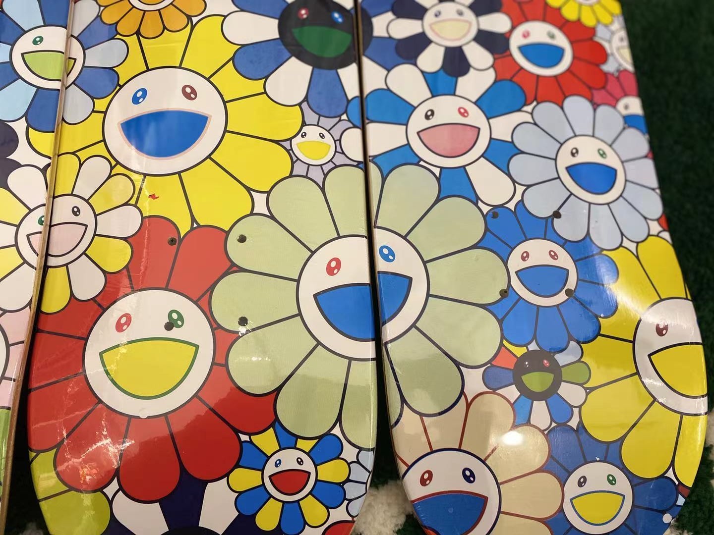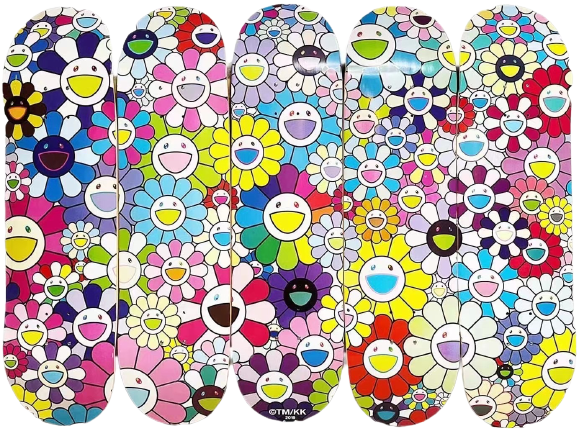 MURAKAMI FLOWER SKATEBOARD DECKS SET features an all-over print of Murakami's iconic flowers which continues its design from one skateboard deck to another.