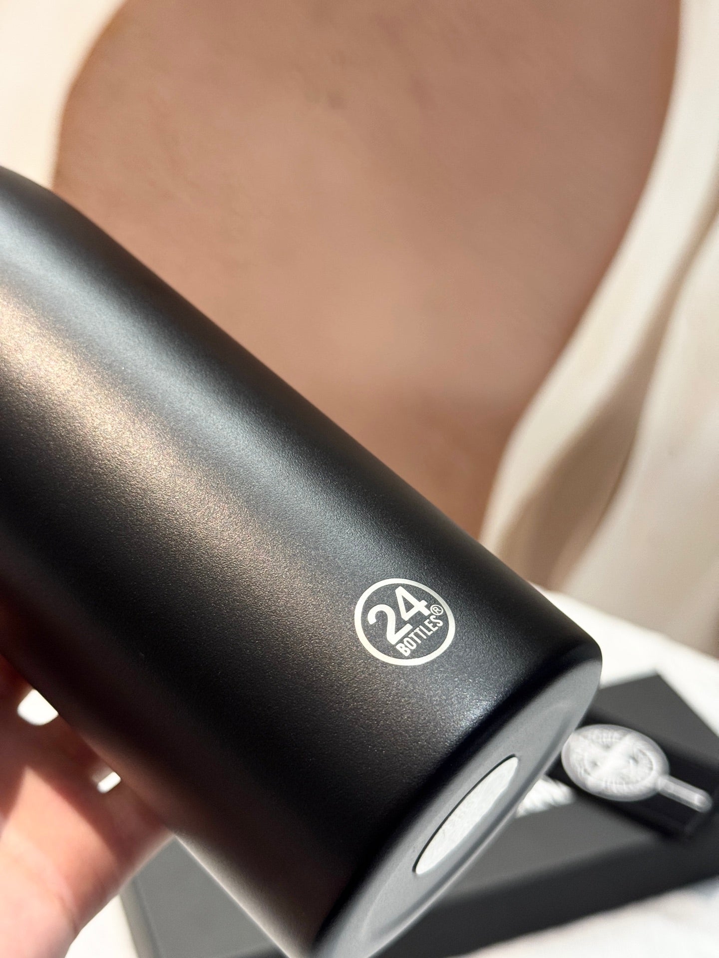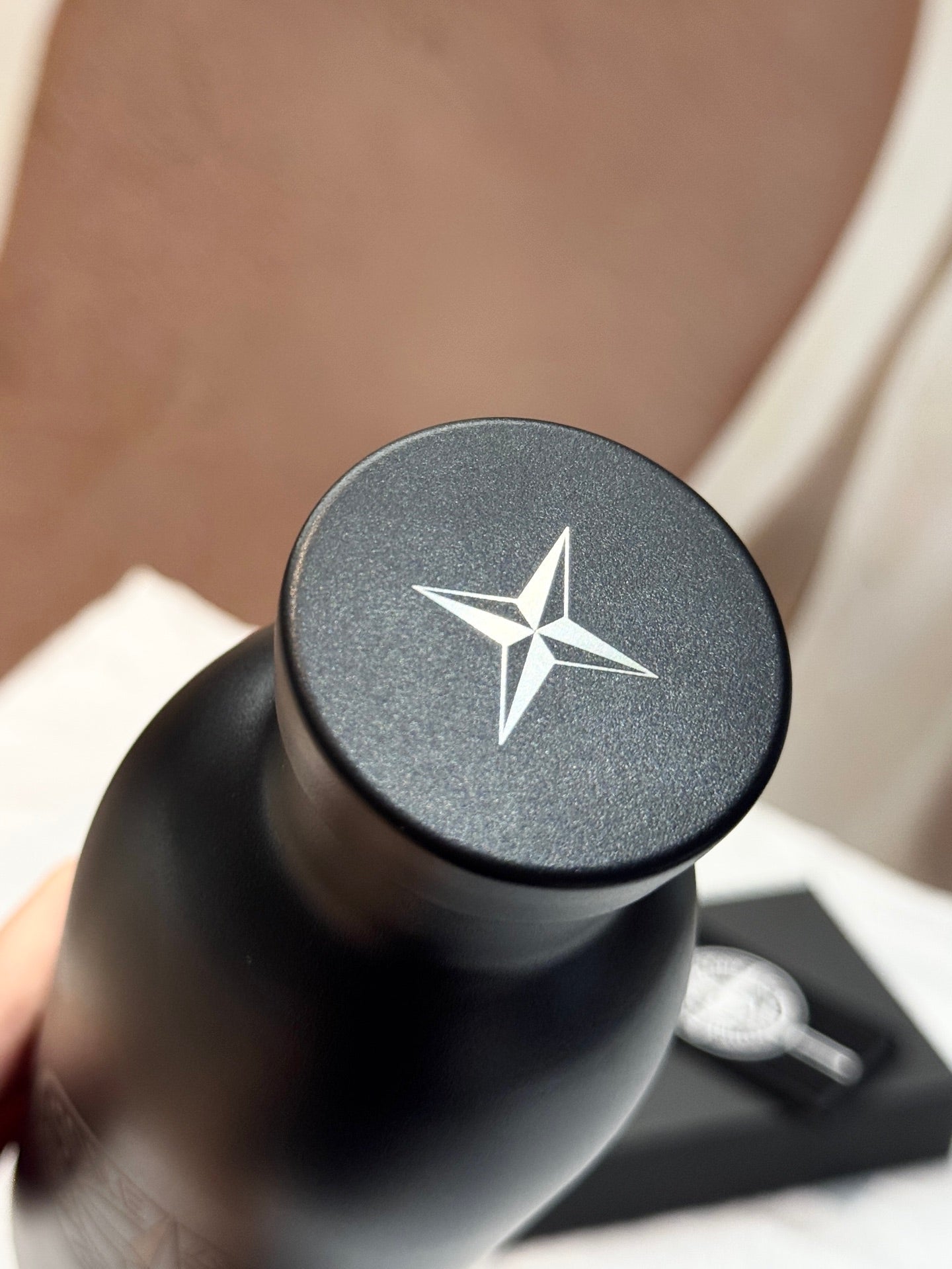 The stainless steel bottle has double-wall vacuum insulation and a leakproof screw-on cap, and is finished in an anodized black style with the brand’s signature compass logo on the front in a creamy-gold tone. More branding can be seen on the rear of the bottle, noting the 24Bottles partnership, while another star adorns the aforementioned cap.