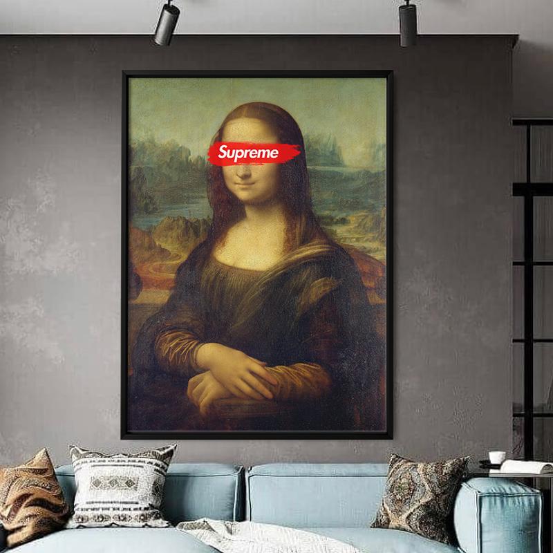 This wall frame features Supreme's take on the sacred Mona Lisa painting, so sacred they needed to cover her eyes.