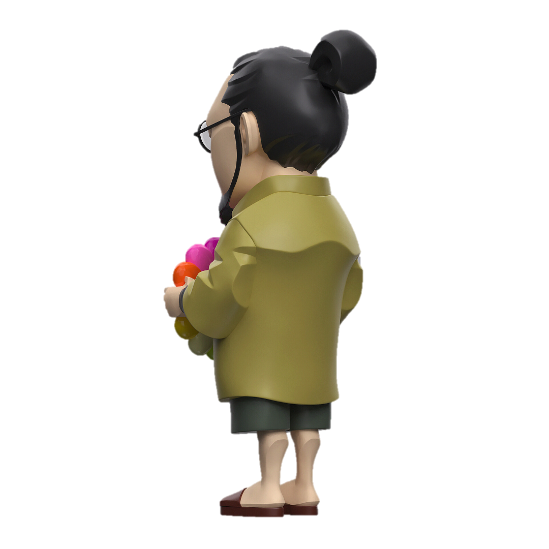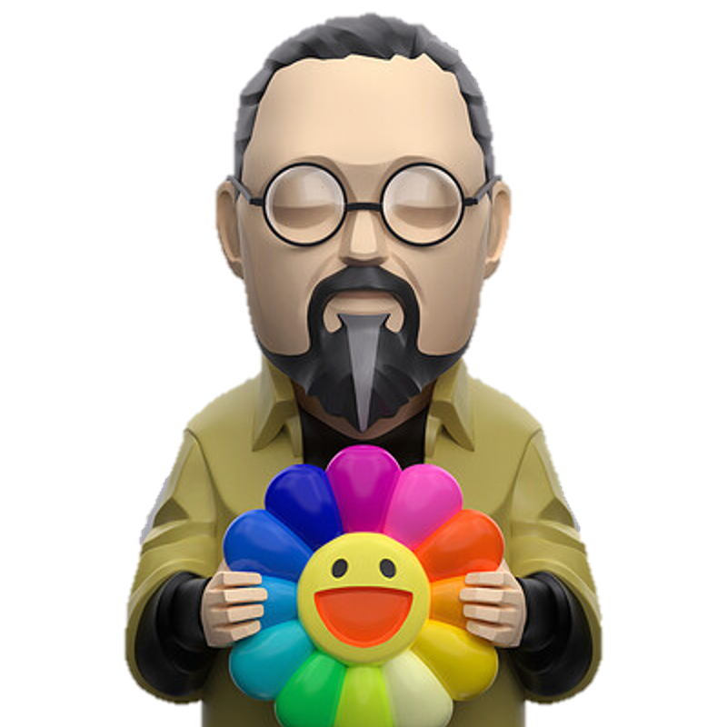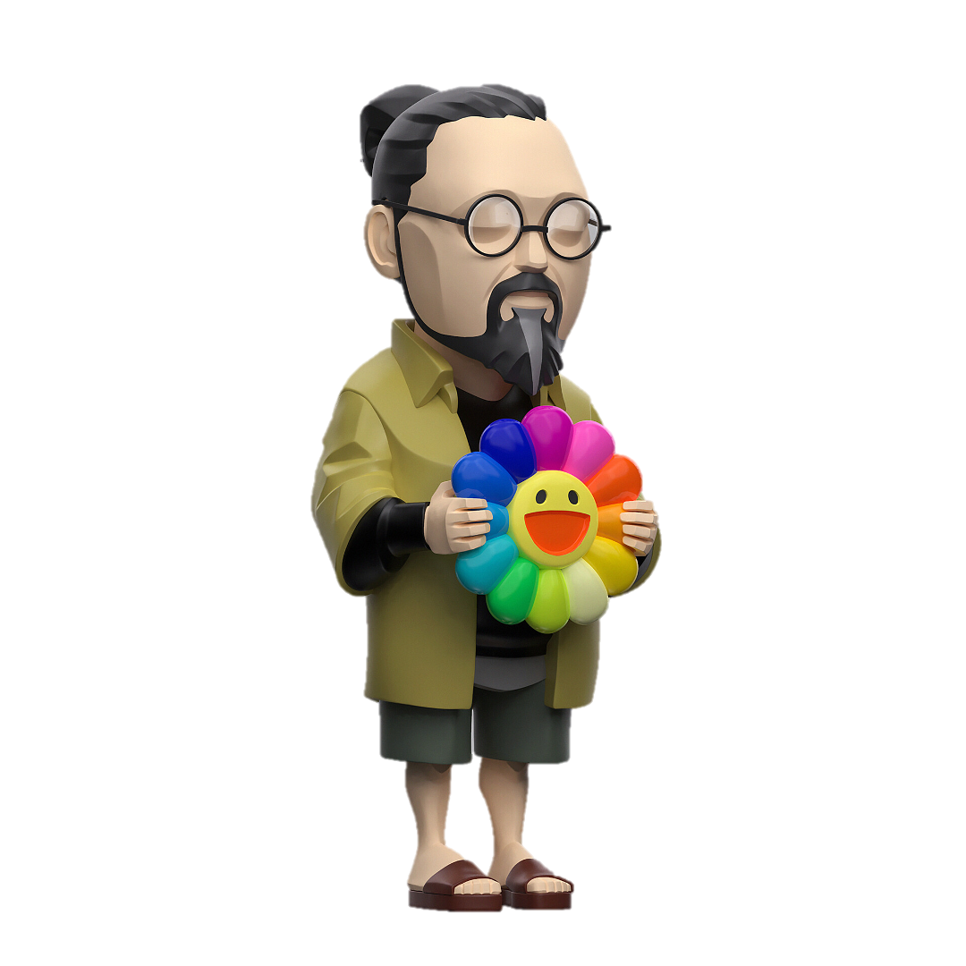 The vinyl toy features Takashi Murakami, the famous streetwear Japanese designer holding his Iconic, legendary status MURAKAMI FLOWER PLUSH design.