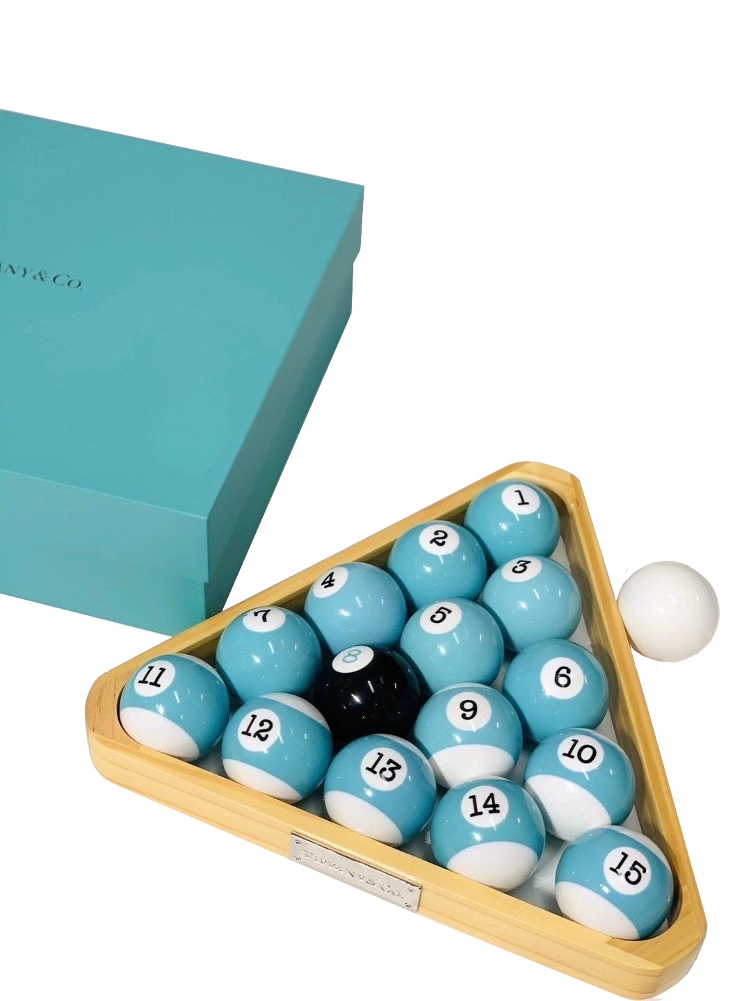 The pool triangle is intricately crafted in oak with a removable sterling silver plate perfect for personalization, while the custom-made Tiffany Blue® pool balls feature a sleek typewriter font.